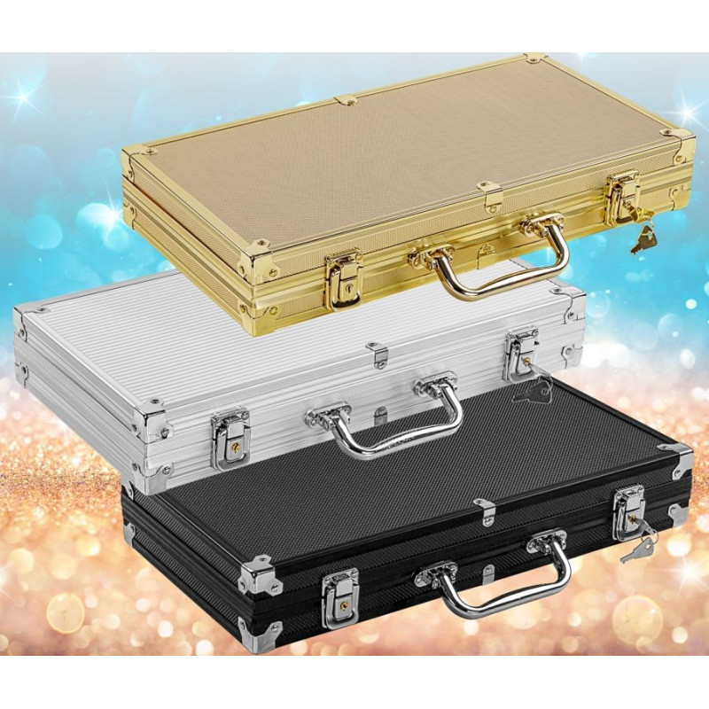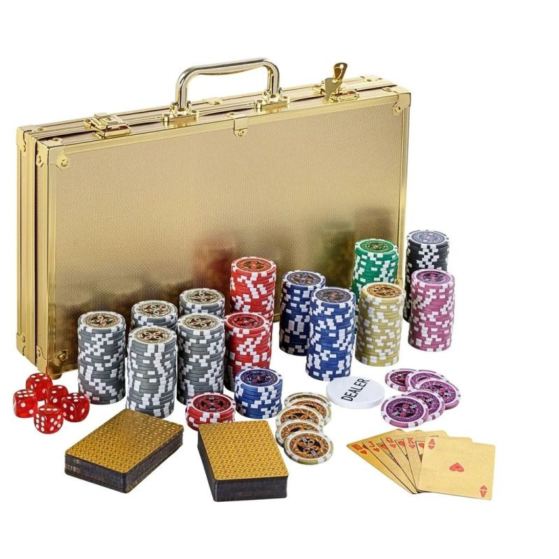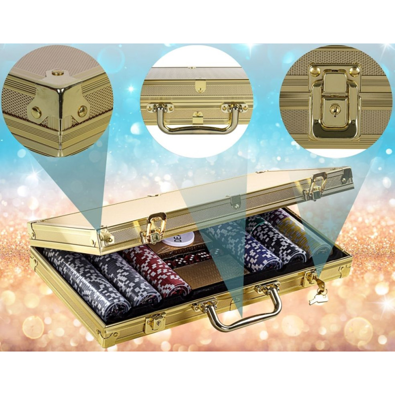 Súprava obsahuje oproti bežným pokerovým setom pravé 100% plastové karty, ktoré sa používajú pri pokerových turnajoch. Tieto karty majú nielen dlhú životnosť a kĺžu po stole lepšie ako papierové karty, ale sú aj umývateľné. Na žetónoch Vás zaujmú nálepky s hologramami, ktoré menia svoj vzhľad pri rôznom dopade svetla. Žetóny vážia 12 gramov (majú kovové jadro) a vy máte pocit, že hráte so skutočnými žetónmi v kasíne. Kufrík ďalej obsahuje 2 balíčky kariet, 5 kociek a dealer button. Táto sada teda zahŕňa všetko, čo budete pre váš pokerový turnaj potrebovať.