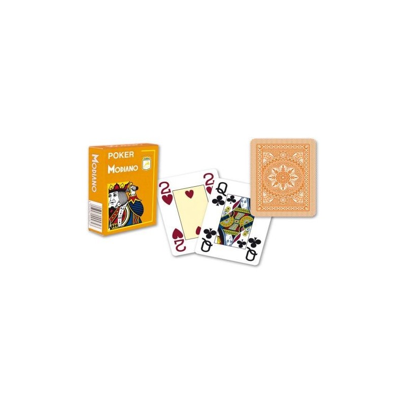Kvalitní pokerové karty ze 100% plastu oblíbené značky Modiano. Karty mají klasický širokoúhlý formát, jsou 8,89 cm vysoké a 6,35 cm široké. Karty jsou čtyřrohé - tedy v každém rohu je uvedena hodnota karty. Modiano karty jsou velice oblíbené u pravidelných hráčů pro svou vysokou životnost a odolnost. Díky složení ze 100% plastu vydrží tyto karty 100 krát více her než karty papírové nebo pouze s plastovým potahem. Karty jsou omyvatelné, vodotěsné a pyšní se svou dlouhou životností.
