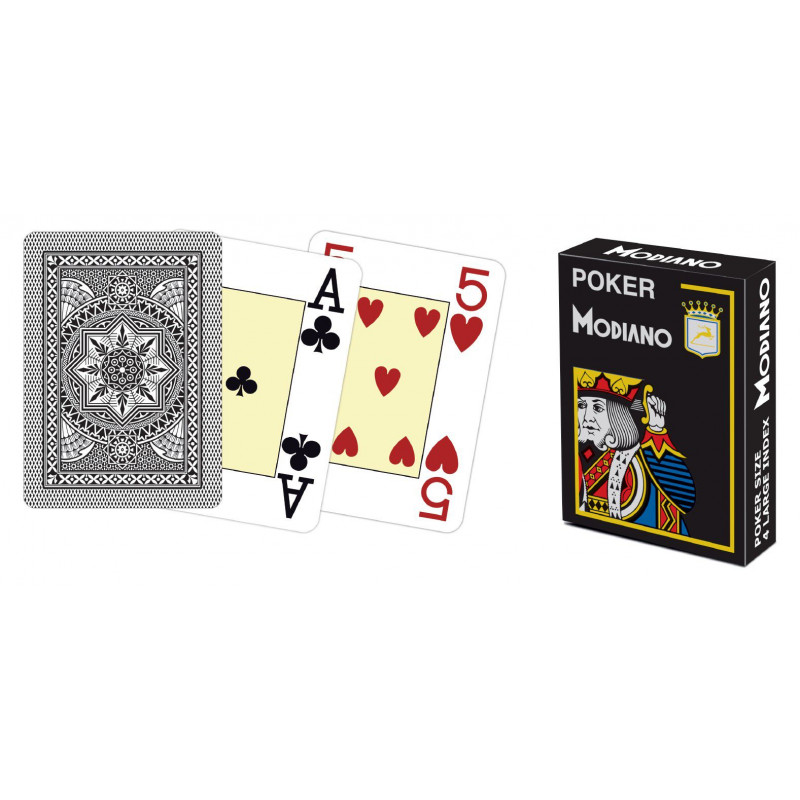 Kvalitné pokrové karty zo 100 % plastu obľúbenej značky Modiano. Karty majú klasický širokouhlý formát, sú 8,89 cm vysoké a 6,35 cm široké. Karty sú štvorrohé - teda v každom rohu je uvedená hodnota karty.