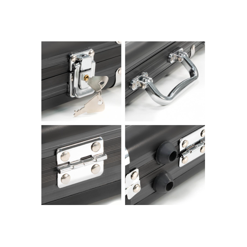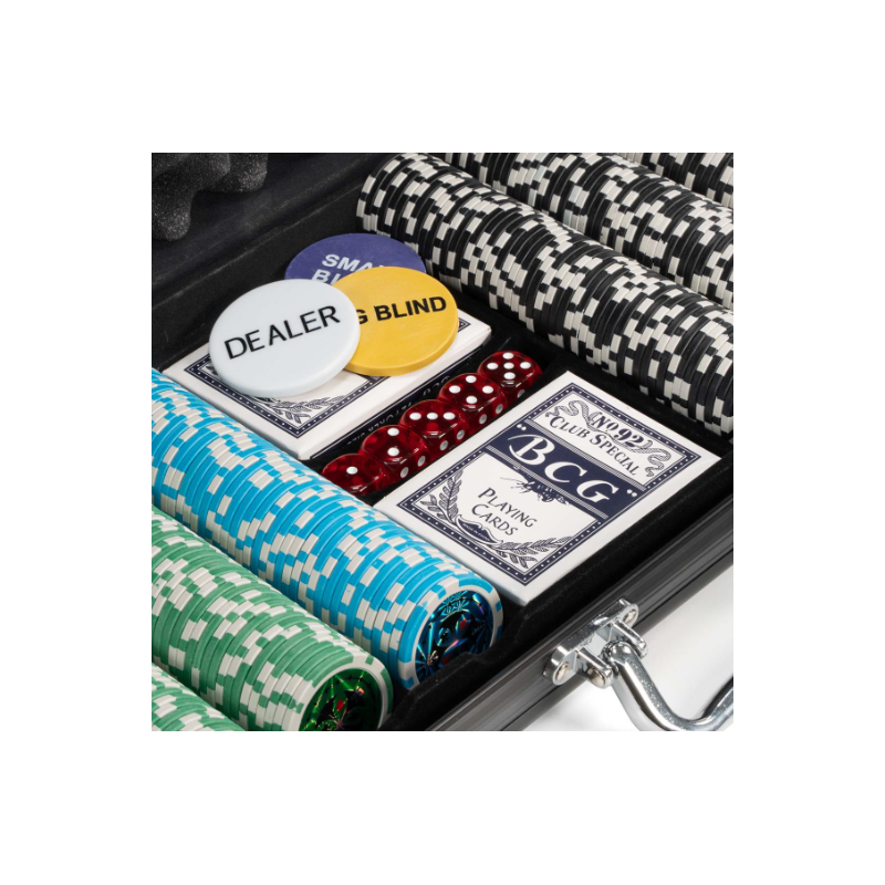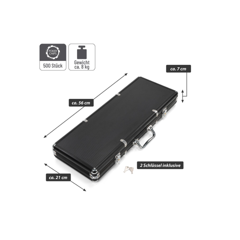 Pokerový herný set s 500 vysoko reflexnými laserovými žetónmi v modernom dizajne. Čipy majú kovové jadro a hmotnosť čipu 11g. Sada kufrov obsahuje pokrové mince (žetóny), malý / veľký blind a tlačidlo dílera, 2 sady pokrových kariet a 5 kociek. Všetko príslušenstvo je možné uložiť do polstrovaného hliníkového puzdra. Pevné a elegantné puzdro z hliníka, má 2 uzamykateľné pracky. Pohodlne sa do neho zmestí všetko herné náčinie. Herná sada obsahuje: 1 tlačidlo dílera, 1 tlačidlo pre „small blind" a „big blind", 5 kasínových kociek, 2 balíčky hracích kariet po 54 dielikoch, 500 pokrových žetónov po 12 gramoch, ktoré sa líšia v rôznych hodnotách a farby a majú vysoko reflexná laserová tlač. Vďaka priloženému nemeckému hernému návodu si pri tejto spoločenskej hre rýchlo užije veľa zábavy aj pokerový začiatočník. Súprava 500 poker obsahuje všetko, čo potrebujete pre príjemný večer pokru. Vysoko reflexné laserové čipy majú kovové jadro s HMOTNOSŤOU ČIPU 12g so zodpovedajúcou potlačou. To ocenia najmä ambiciózni hráči pri skladaní a miešaní. Na tomto modeli sme spolupracovali s profesionálnymi hráčmi pokru, aby sme zaistili optimálnu distribúciu žetónov. Napríklad v našej sade nie sú žiadne žetóny s hodnotou 1, pretože tie sa v pokri obvykle nepoužívajú. V našom sortimente máme veľký výber žetónov v rôznych prevedeniach as rôznymi nominálnymi hodnotami, rovnako ako podložky pod stôl, pokrové stoly a ďalšie príslušenstvo. Nevhodné pre deti do 7 rokov, nebezpečenstvo udusenia. Používajte pod dohľadom dospelej osoby.