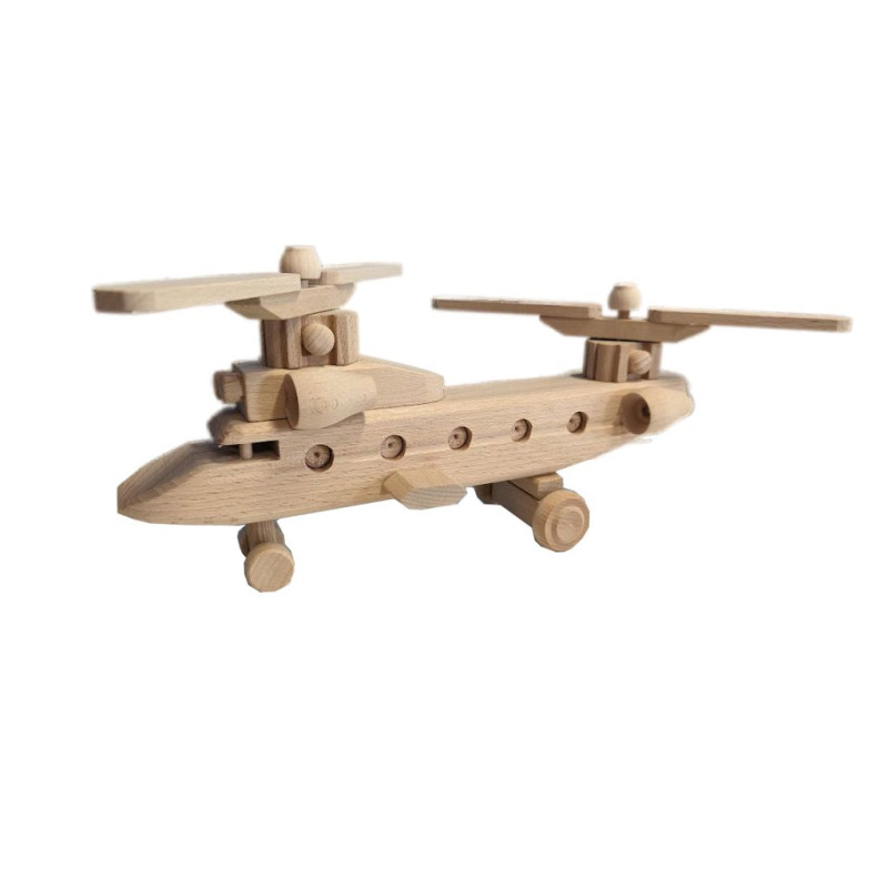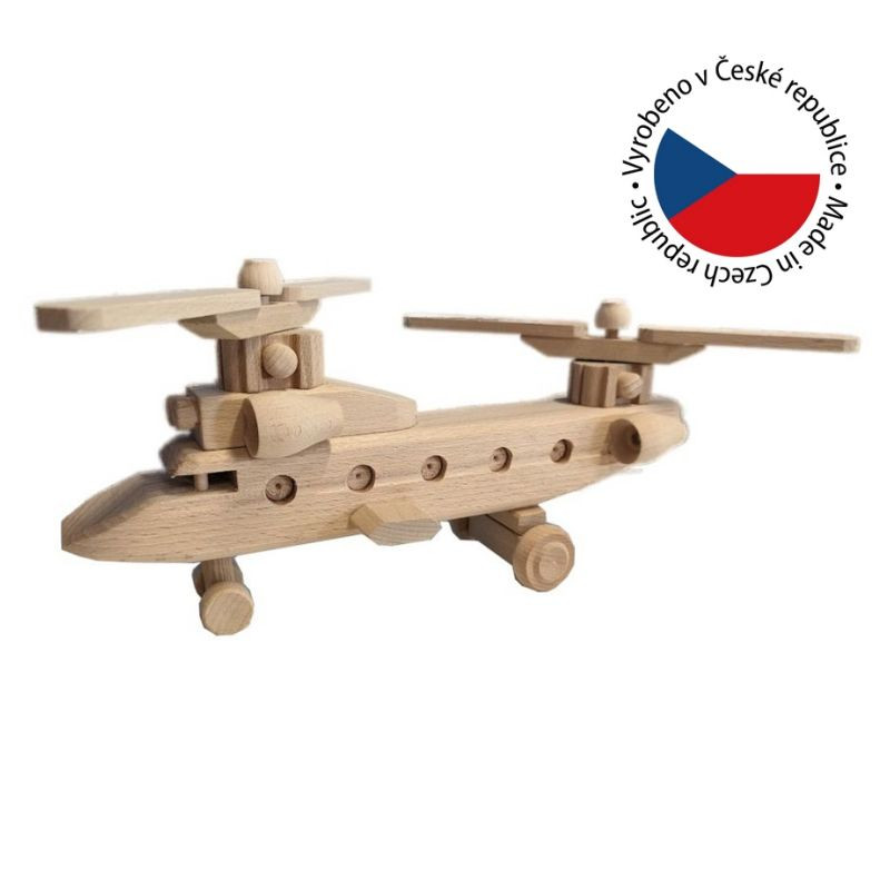 Helikoptéra je vyrobená z masívneho bukového dreva, ktoré nie je povrchovo ošetrené. Dekoratívna helikoptéra z masívneho bukového dreva Vám vydrží niekoľko generácií. Všetko je precízne spracované, drevo obrúsené, kolesá a vrtule sa dajú otáčať.