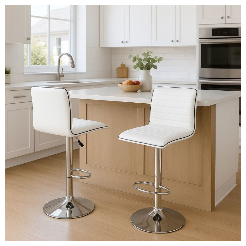 Použitie a výhody: Stolička je vhodná pre domáce aj komerčné použitie. Ponúka pohodlie vďaka polstrovanému sedáku a je ideálny do kuchynských ostrovčekov, barov alebo spoločenských priestorov. Výškovo nastaviteľný piest zaisťuje ľahké prispôsobenie pre rôzne typy stolov alebo barov. Opierka na nohy a stabilná základňa poskytujú bezpečnosť a komfort pri každodennom používaní.