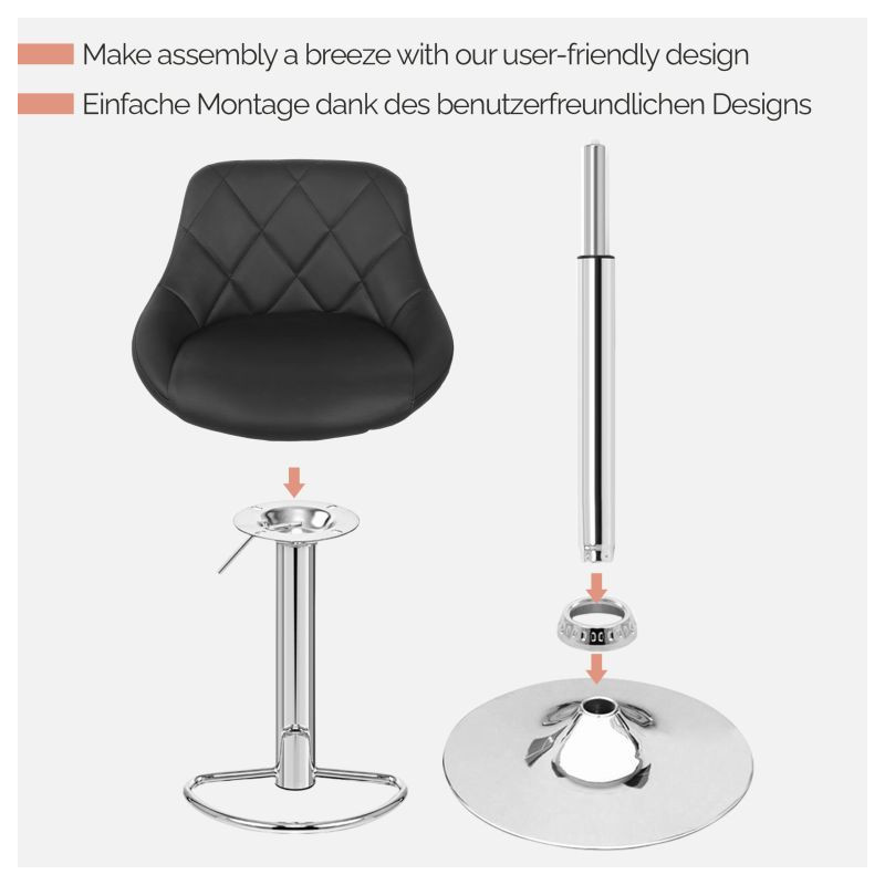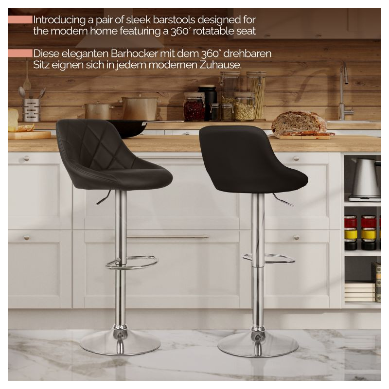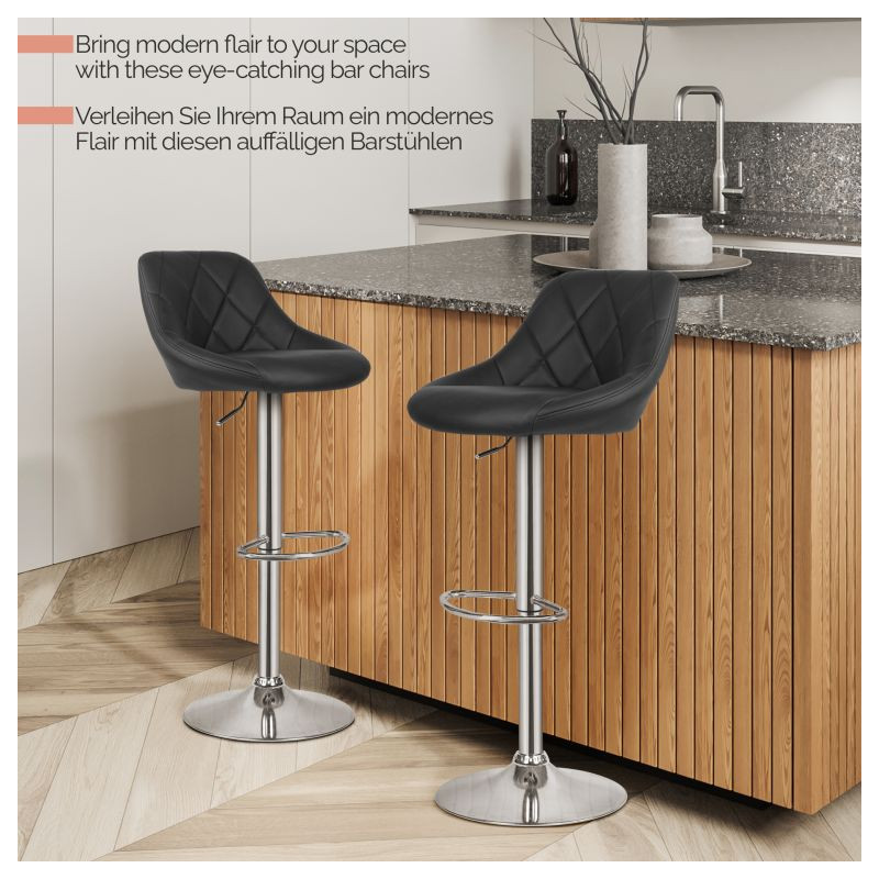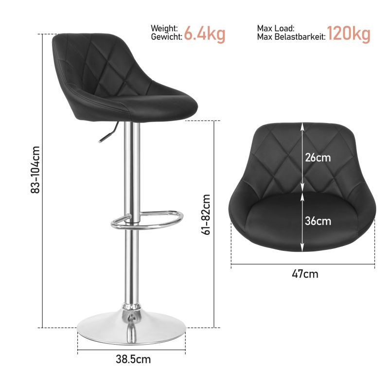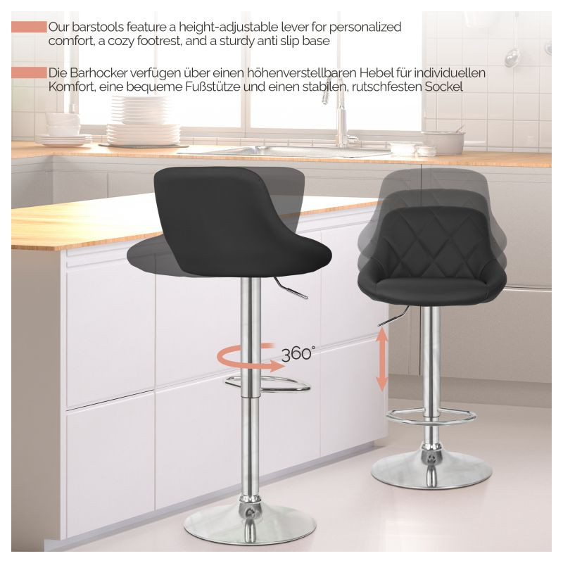 Premeňte svoj priestor pomocou týchto elegantných barových stoličiek, ktoré sa skvele hodia do kuchyne, baru alebo kancelárie. Vďaka výškovo nastaviteľnému mechanizmu sú flexibilné pre všetky výšky pultu, zatiaľ čo chrómovaný oceľový rám a zaoblená 38,5 cm vysoká základňa zaisťujú robustnosť a stabilitu.