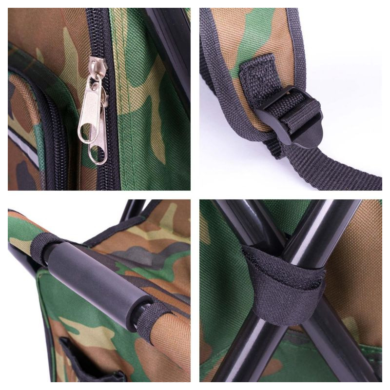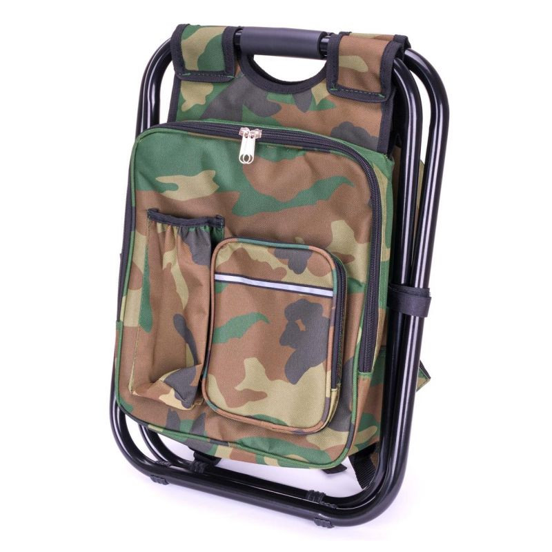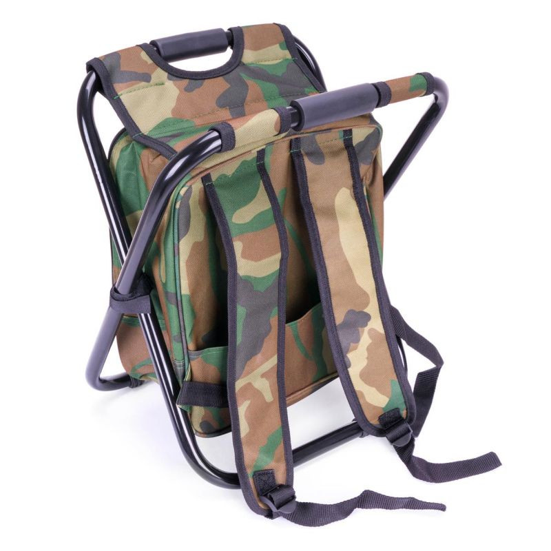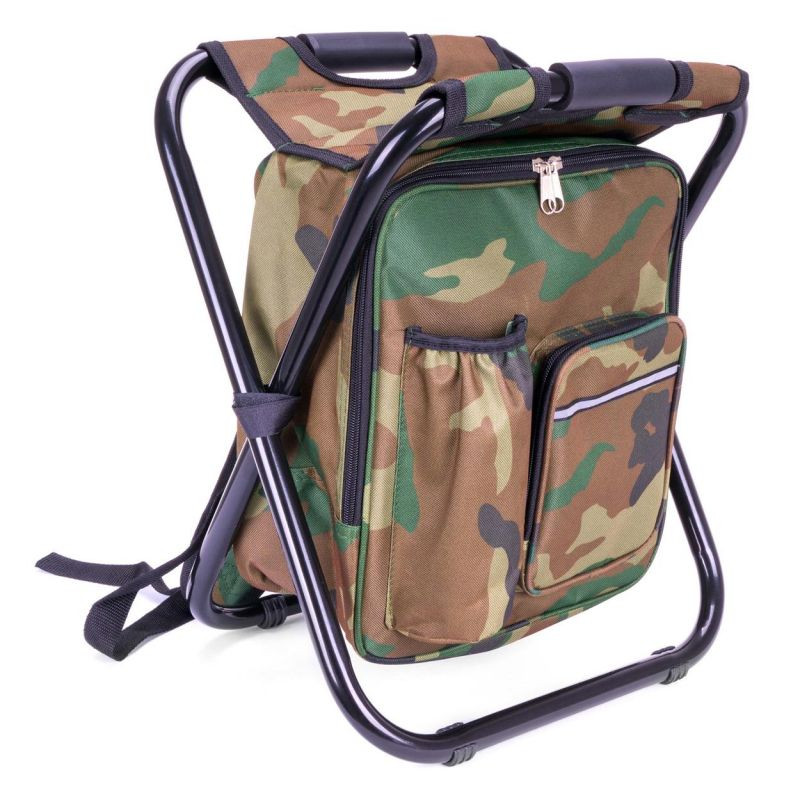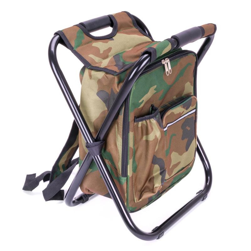 Turistický batoh v maskovacej farbe so skladacou stoličkou, chladiacou taškou, držiakom na nápoje a vonkajšími vreckami.