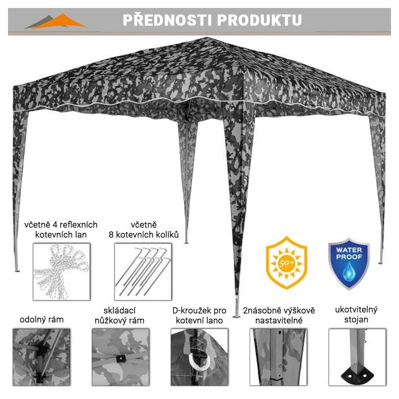 Profesionálny skladací stan s nožnicovou konštrukciou, vďaka ktorej stan veľmi ľahko a rýchlo postavíte a opäť zložíte. Stan Vám poskytne dostatok tieňa v sparných dňoch, ochranu pred večerným prievanom a môže tiež slúžiť ako ochrana proti miernemu vetru a dažďu. Stan nie je určený do nepriaznivého počasia ako sú silné dažde, vetry a búrky. Nikdy nenechávajte stan bez dozoru.