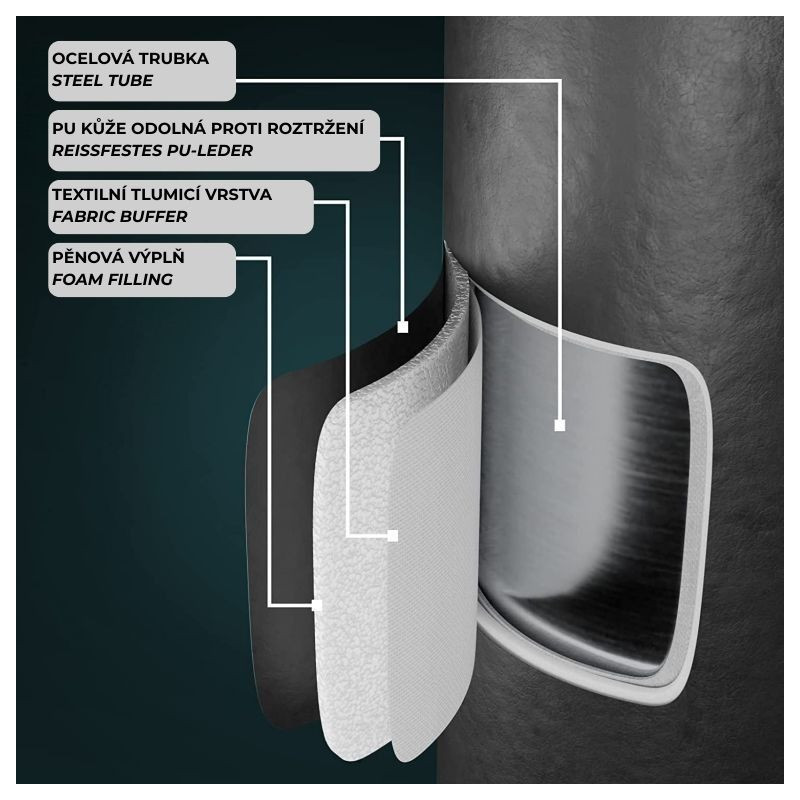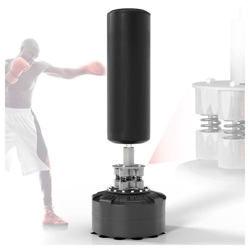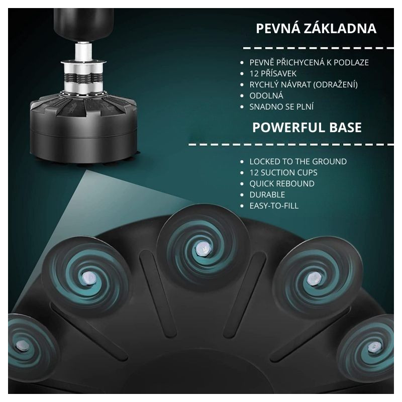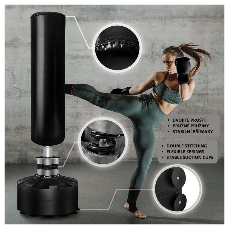 Masívna základňa s 12 prísavkami a možnosťou naplnenia vodou či pieskom zaručuje maximálnu stabilitu aj pri silných úderoch. Pružinový mechanizmus so štyrmi oceľovými pružinami zaisťuje realistický odpor a rýchly návrat vreca do pôvodnej polohy. Boxovacie vrece je ručne šité z odolnej PU kože a nylonu, čo garantuje dlhú životnosť a komfortný tréning bez nutnosti montáže na stenu alebo strop.