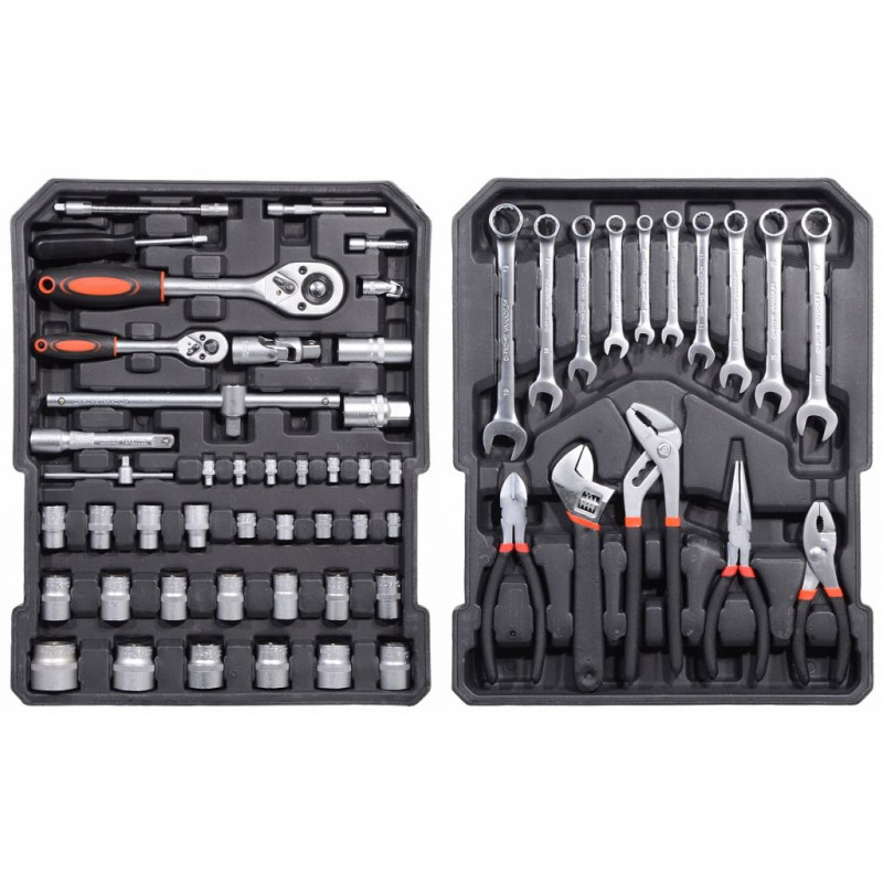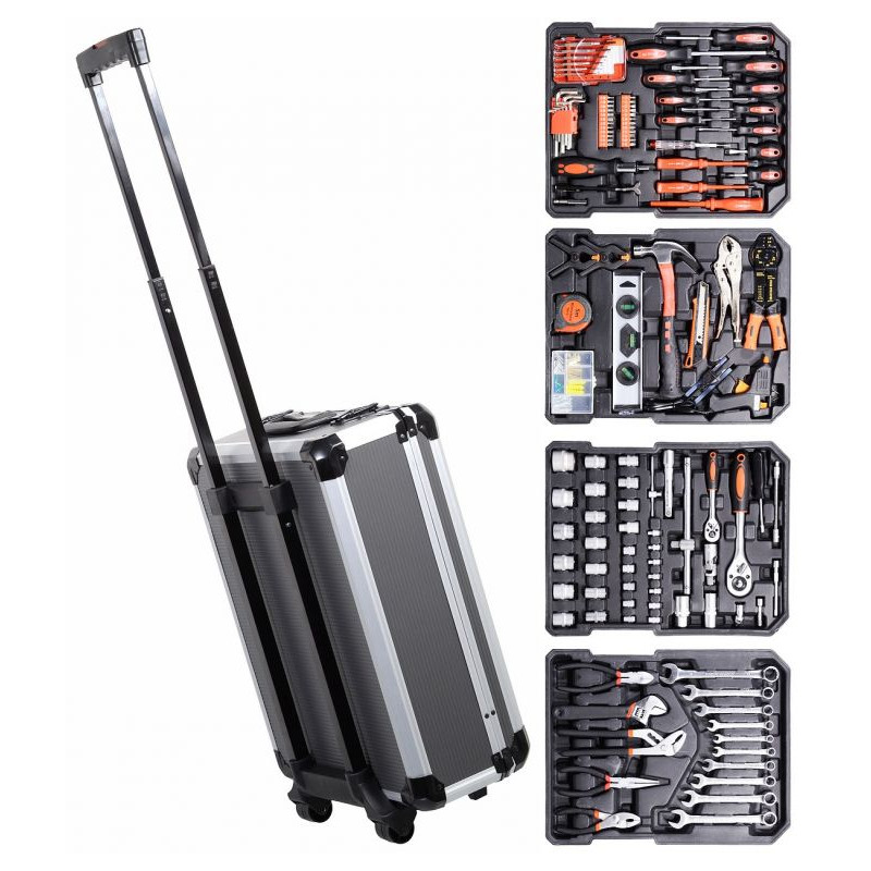 Všetko usporiadané v prehľadných pozíciách - 4 nástrojové platá. Kufrík je vybavený teleskopickým úchytom a kolieskami, vďaka ktorým je manipulácia s celou sadou náradia veľmi jednoduchá. Sada obsahuje celý rad klieští, skrutkovačov, gola kľúčov, kladivo, vodováhu, stranové aj imbus kľúče, bity, základný spojovací materiál a celú radu ďalšieho náradia, ktoré je vhodné pre použitie doma, v garáži, aj na cestách.