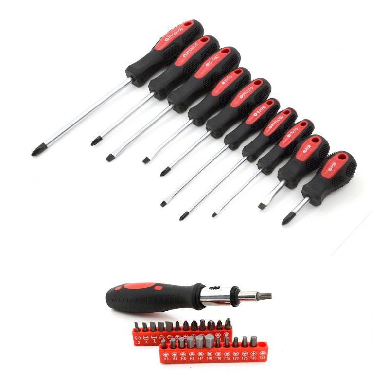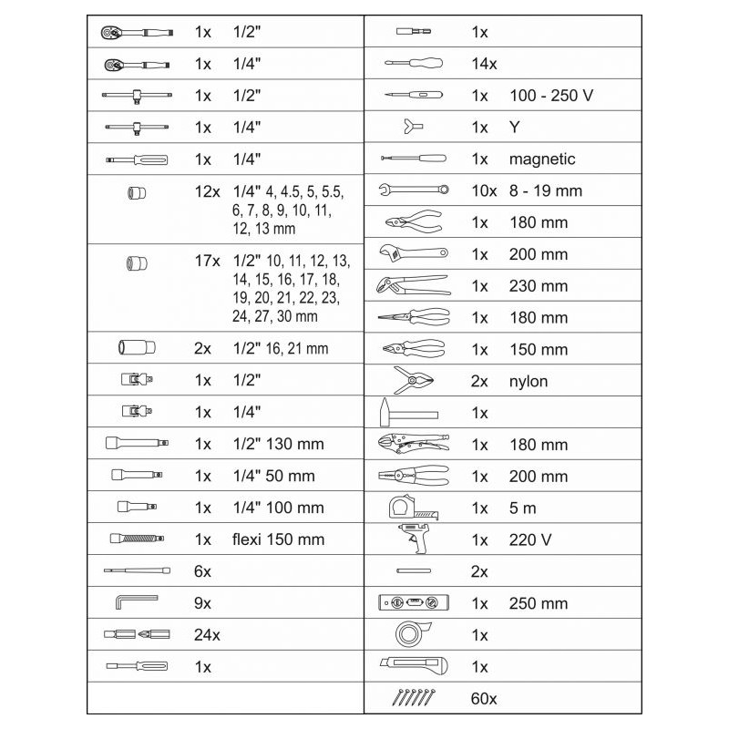 - 6 x skrutkovač hodinársky, 9 x imbus kľúč, 24 x bit (plochý, krížový, torx, imbus), 1 x skrutkovač na bity, 1 x nadstavec na bity (šesťhran), 14 x skrutkovač (krížový, plochý), 1 x skúšačka 100 - 250 V, 1 x bit Y, 1 x vyťahovák magnetický teleskopický