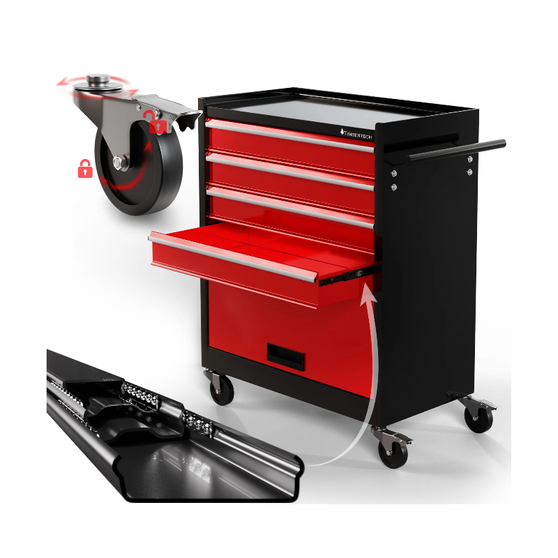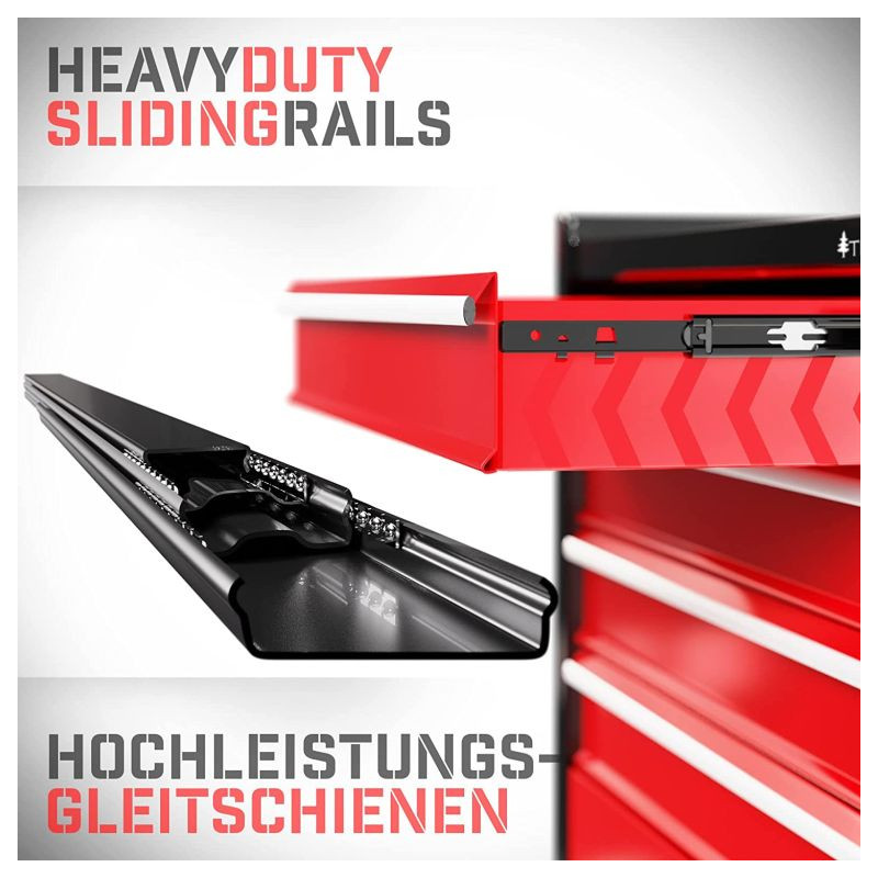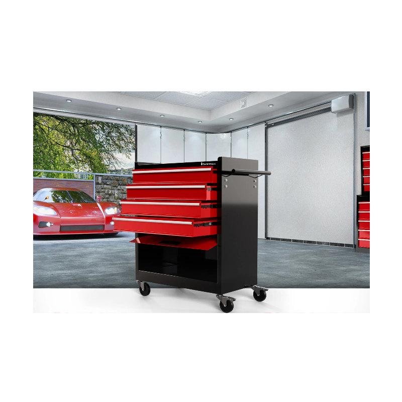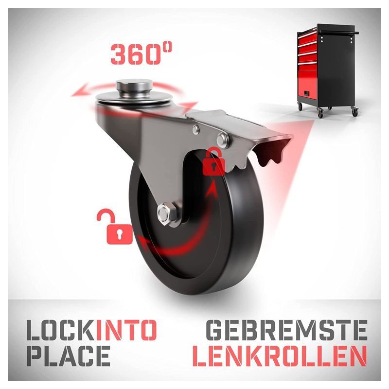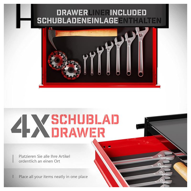 S týmto vozíkom na náradie môžete udržiavať poriadok v dielni alebo na pracovisku. Tento pojazdný dielenský vozík je vyrobený z odolnej a robustnej ocele a bude vám slúžiť mnoho rokov. Praktický montážny vozík sa skladá zo štyroch zásuviek a jednej priehradky. Polička poskytuje ďalší priestor pre usporiadanie často potrebného náradia.