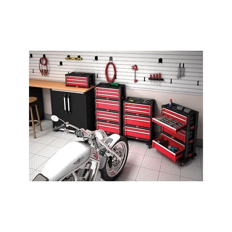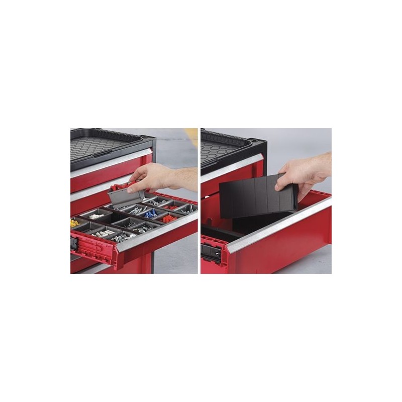 Masívny úložný box z pevného a odolného plastu s dvomi zásuvkami. Zásuvky majú rozdielnu veľkosť, vrchná zásuvka je vhodná na spojovací materiál a iné drobnosti a je rozdelená na štyri menšie priehradky. Spodná zásuvka je objemnejšia a môžete ju preto použiť aj na väčšie náradie. Box je stohovateľný, možno ho kombinovať s ďalšími KETER boxami. Ideálny do garáží alebo dielní. Vysoká kvalita značky KETER.