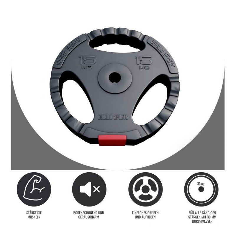 Plastový plášť je zaoblený, a preto je obzvlášť šetrný k podlahe. Vďaka priehlbinám v rukovätiach ju môžete ergonomicky uchopiť a používať ju pri cvičení. Okrem toho má kotúč praktický otvor s priemerom 31 mm, ktorý umožňuje používať závažie navyše na činky alebo činky s tyčou s priemerom 30 mm. Najmä pri "sklapovačkách" so závažím sa môžete cítiť celkom nepríjemne, pokiaľ je ťažké váhu udržať. Riešením je záťažová doska s plastovým úchytom.