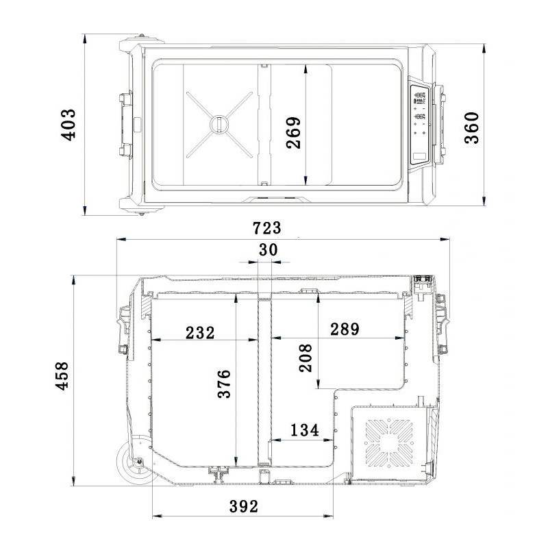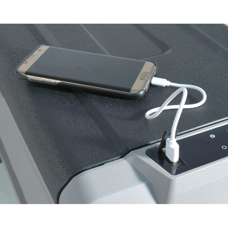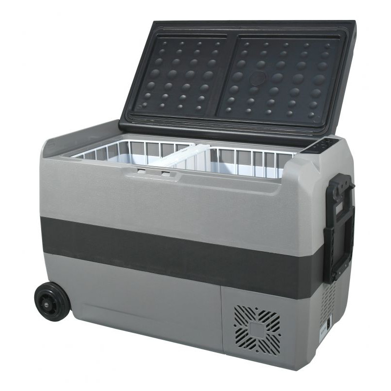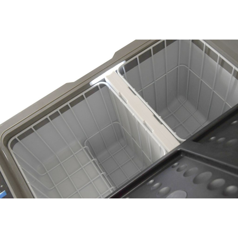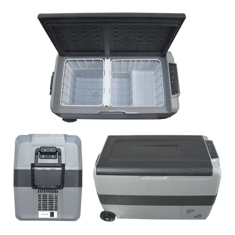 Chladiaci box môže byť napájaný z 12 V alebo 24 V zásuvky automobilov či lodí, alebo z bežnej zásuvky 230 V. Je vybavený výkonným kompresorom s chladiacim médiom a možno ho použiť ako chladničku s teplotou 0 - 10 °C, ale aj ako mraziaci box s teplotou až -20 °C. Režimy chladiaceho boxu zahŕňajú ECO mode pre úsporu elektrickej energie a MAX mode pre rýchle ochladenie obsahu až k -20 °C (pri okolitej teplote 25 °C). Ďalej je box vybavený inteligentným systémom ochrany pred vybitím pripojeného akumulátora, ktorý možno nastaviť cez menu prístroja. Chladiaci box má osadený displej so všetkými ovládacími prvkami. Vnútorný priestor boxu je rozdelený do dvoch častí s možnosťou rozdielneho nastavenia teplôt, alebo možno vybrať deliacu priečku a využiť tak celý priestor ako jeden. Vďaka tomu je možné rozloženie potravín a nápojov podľa požiadaviek na optimálne chladenie. Vnútorný priestor boxu je ďalej vybavený LED osvetlením. Madlá na vonkajšej strane boxu z odolného plastu spoločne s gumovými kolieskami zaisťujú výbornú mobilitu zariadenia. Vonkajší plášť je vyrobený z odolného plastu sivej farby, ktorý spolu s perfektnou PU izoláciou zaisťuje dlhodobé zachovanie stabilnej teploty vo vnútri boxu a zaručuje veľmi nízku spotrebu energie. Okraj ovládacieho panelu je doplnený o zakrytú USB zásuvku pre napájanie zariadení s USB konektorom.