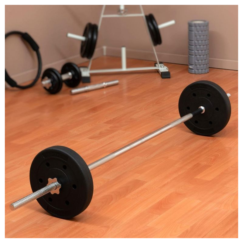 Pokiaľ chcete budovať svaly, trénovať alebo jednoducho zostať fit, je táto činková sada pre Vás tá pravá. Nezáleží na tom, či trénujete paže, chrbát, brucho alebo bicepsy – naša sada je univerzálna. Vďaka vrúbkovanému povrchu rukoväte sa pri tréningu ešte lepšie drží. Hviezdicové zámky spoľahlivo fixujú záťažové dosky.