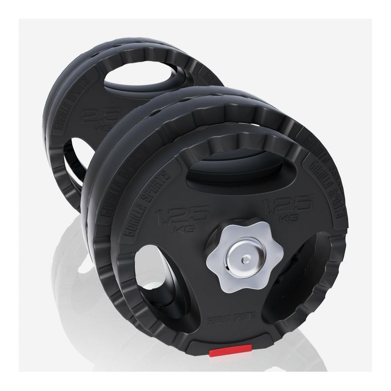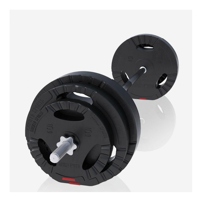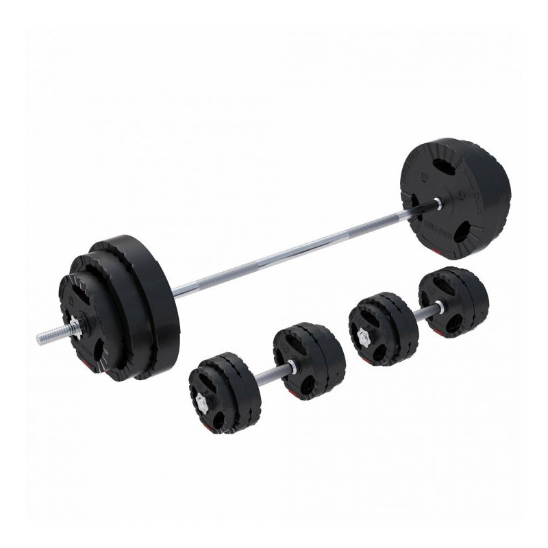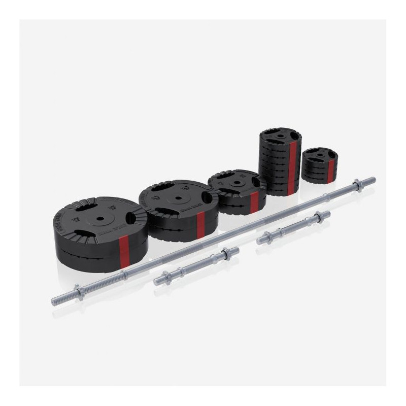 Technicky prepracované tyče s hviezdicovými zámkami umožňujú rýchlu výmenu kotúčov. Plastový plášť závaží chráni podlahu a žebrované úchopové plochy poskytujú stabilitu pri každom cviku. Sada je vhodná pre všetky kotúče s otvorom 30/31 mm a vďaka rozmanitosti závaží je ideálna pre začiatočníkov aj pokročilých.