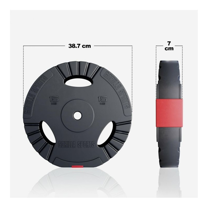- Kotúče: plastový plášť, cementová výplň, 4x 1,25 kg (Ø 18,5 cm), 8x 2,5 kg (Ø 22,5 cm), 2x 5 kg (Ø 28,2 cm), 2x 10 kg (Ø 35,7 cm), 2x 15 kg (Ø 38,7 cm)