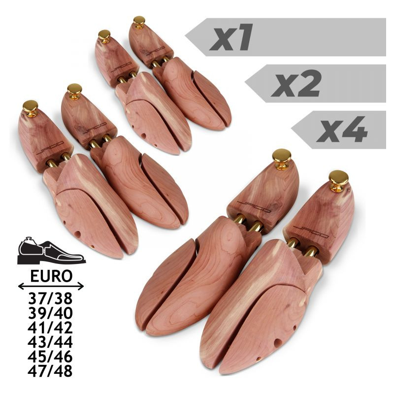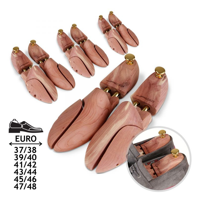 Poznámka: Topánky nie sú súčasťou balenia. Vzhľadom na to, že tvarovač na topánky je vyrobený zo skutočného prírodného dreva, sú možné drobné odchýlky vo farbe a štruktúre. Na tvarovači sa môže usadzovať jemný biely prach. Ide o prirodzenú kryštalizáciu, ktorá je pre cédrové drevo typická. Tvarovače na topánky jednoducho utrite handričkou.