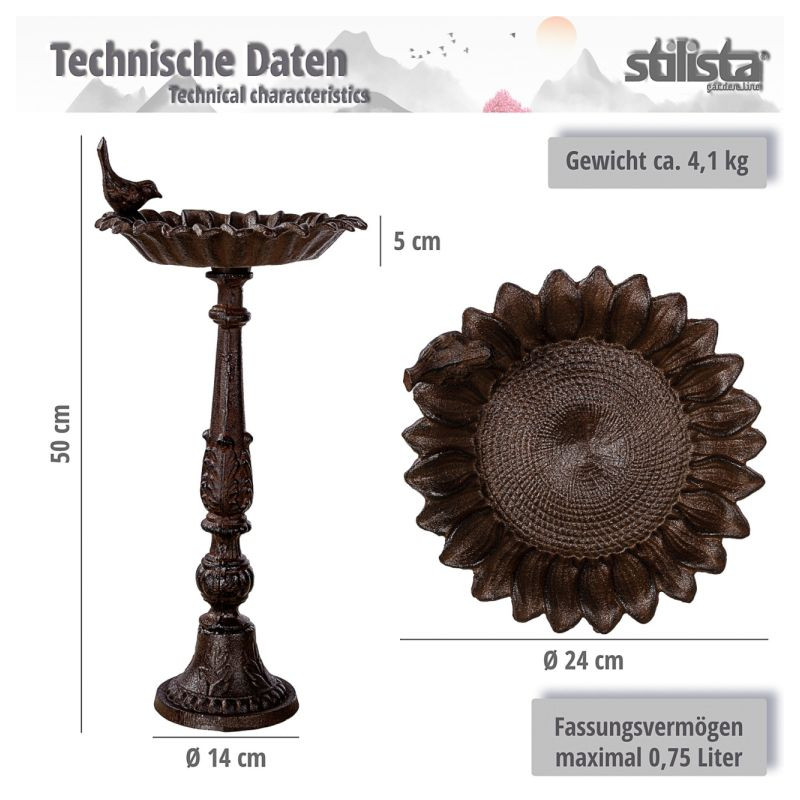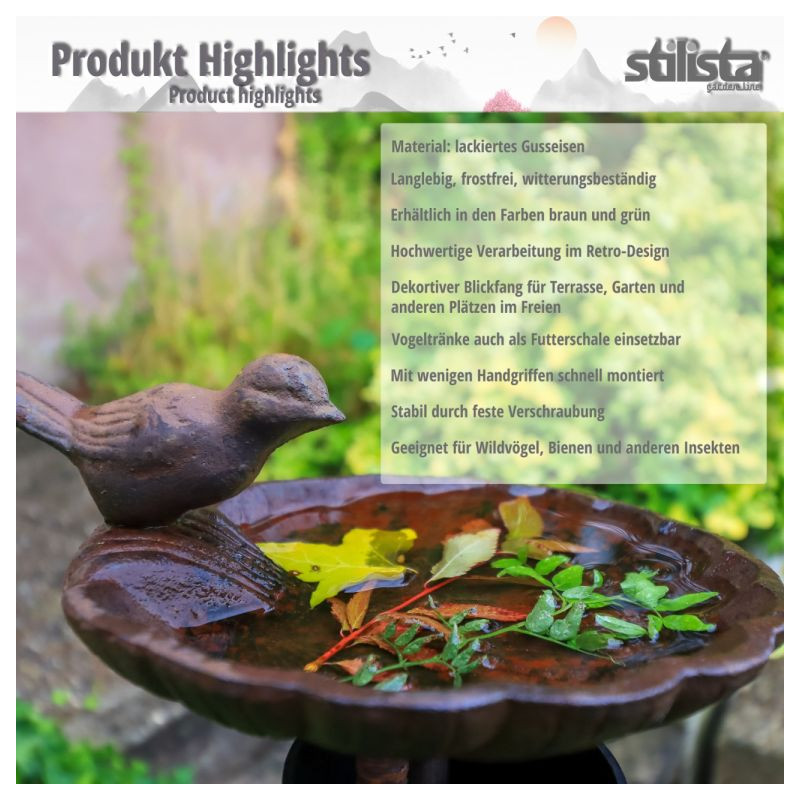 Napájadlo je vyrobené z liatiny a je odolné proti mrazu a poveternostným vplyvom. Jednotlivé prvky sú k sebe priskrutkované, čo zaisťuje vysokú stabilitu. Miska na vodu je vhodná nielen pre vtáčiky, ale aj pre včely, čmeliaky, motýle a ďalšie. Na jeseň a v zime sa dá využiť aj ako krmítko pre vtáky.