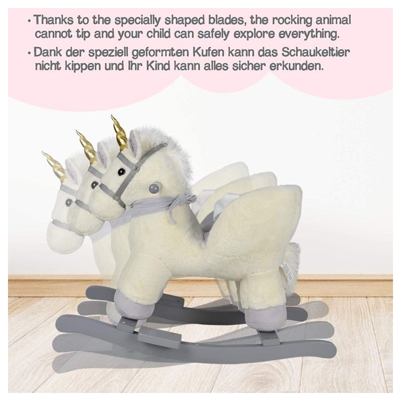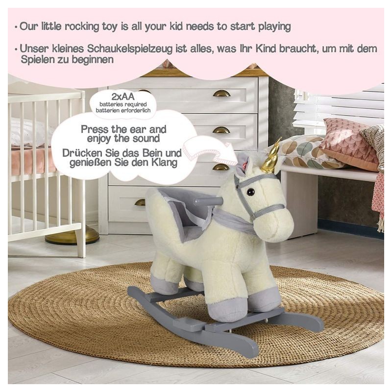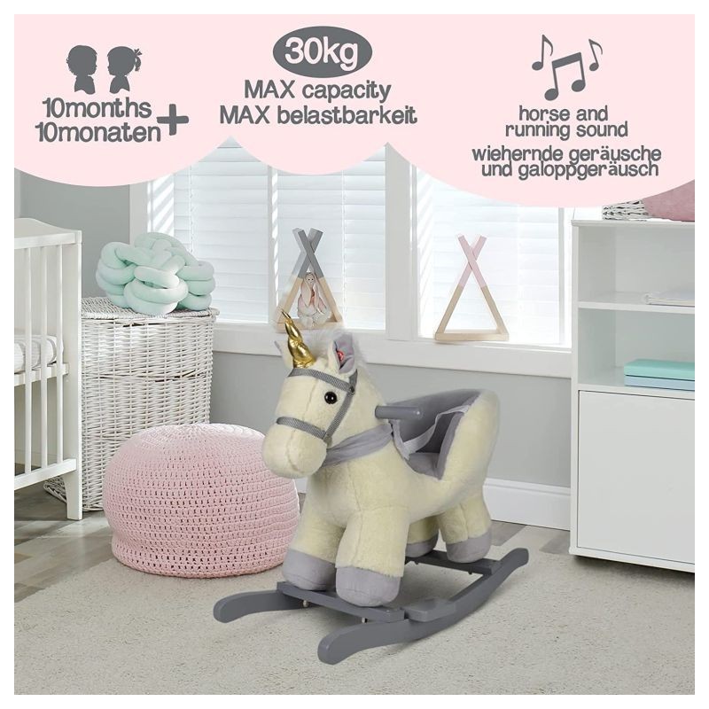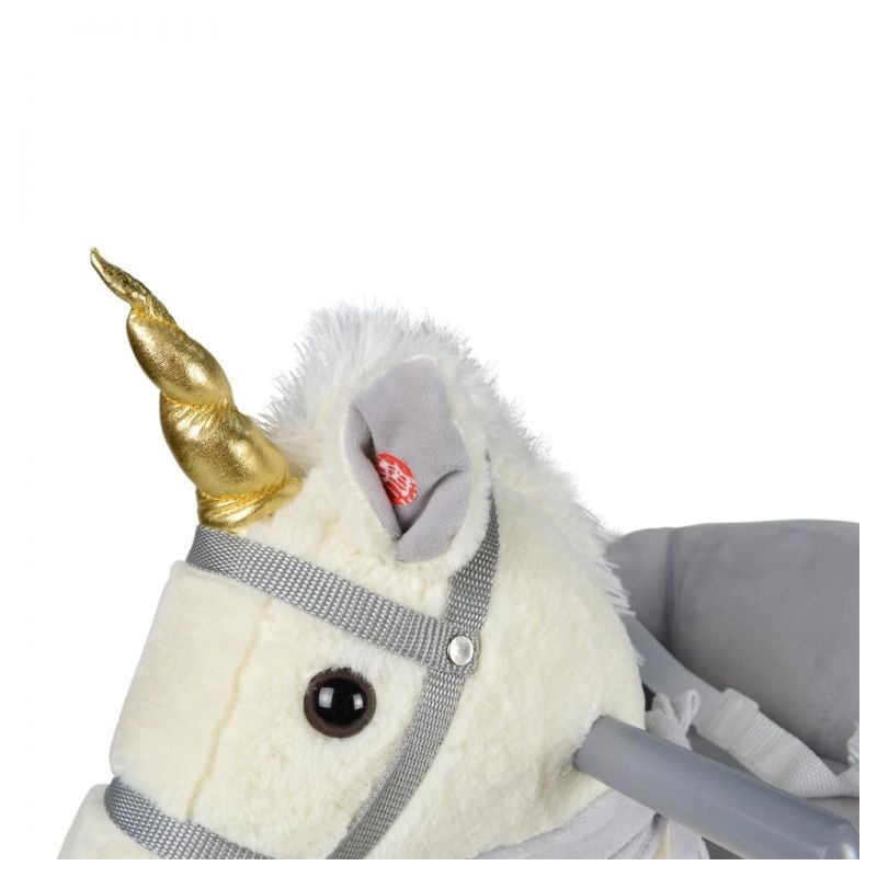 Naša malá hojdacia hračka môže byť dokonalým spoločníkom pre Vaše dieťa a jeho cestou do sveta kreatívnej hry a fantázie. Hojdací kôň je vybavený nastaviteľným bezpečnostným pásom a má dve praktické držadlá, ktoré udržujú rovnováhu, a opierky nôh, ktoré zaisťujú stabilitu. Trojstranný útulný priestor na sedenie a navyše hudobné funkcie - Vaše dieťa nepotrebuje viac, aby si mohlo začať hrať.