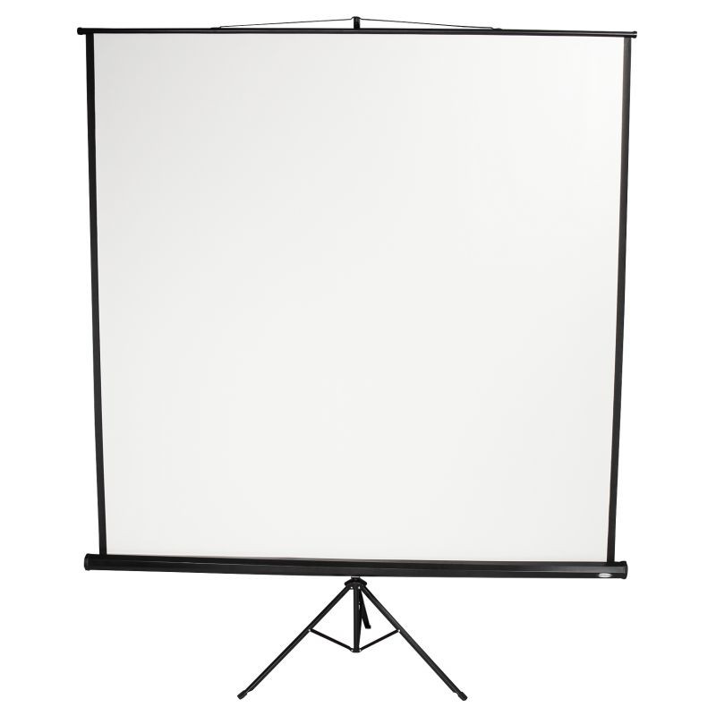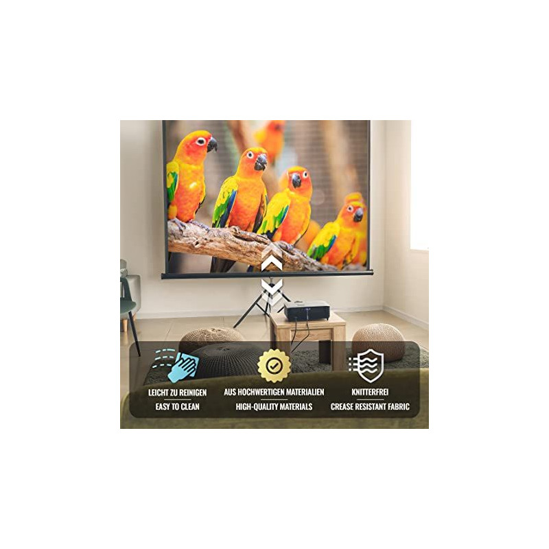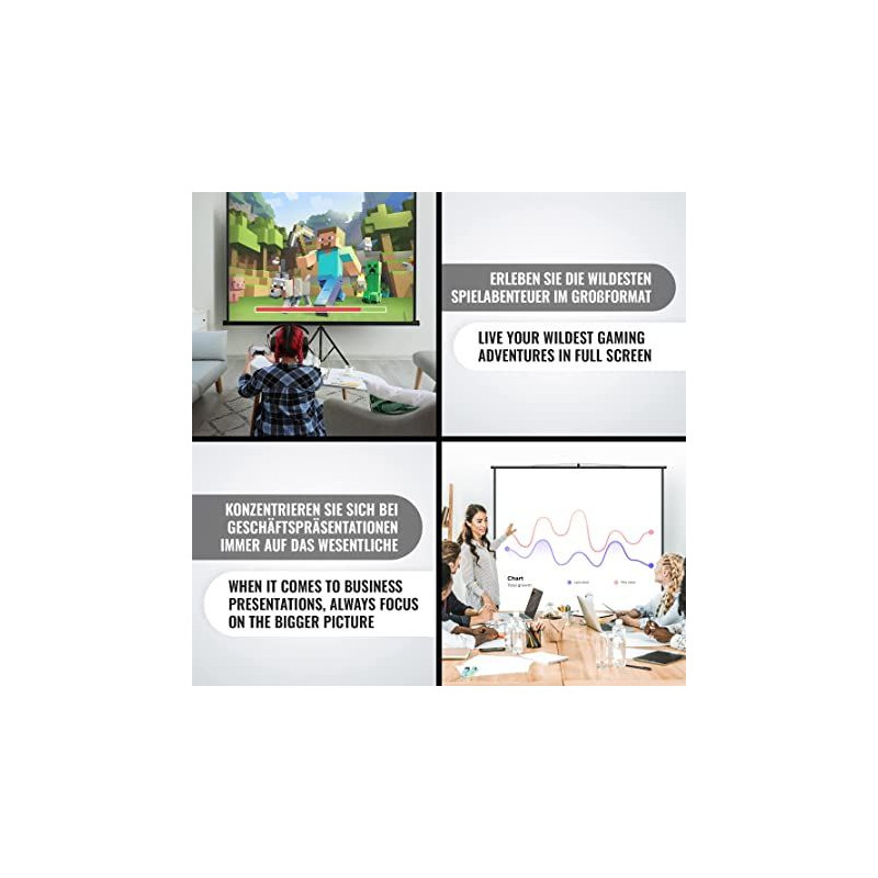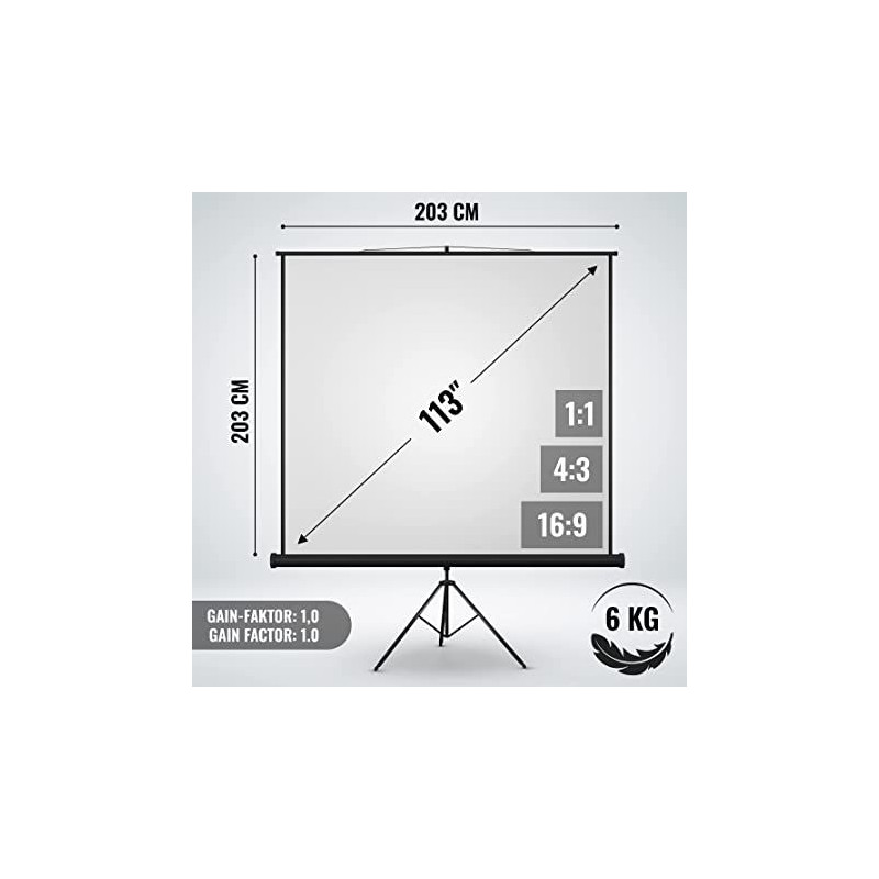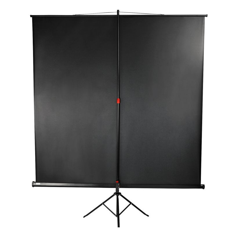 Robustný kovový statív zaisťuje bezpečný stojan. Plátno je vyrobené z trojvrstvovej tkaniny a je potiahnutý vinylom, takže sa ľahko čistí. Čierne maskovanie okrajov po stranách a čierna zadná strana plátna zaisťujú optimálny kontrast. Záťažová tyč zabraňuje zbytočným záhybom.