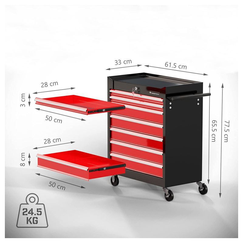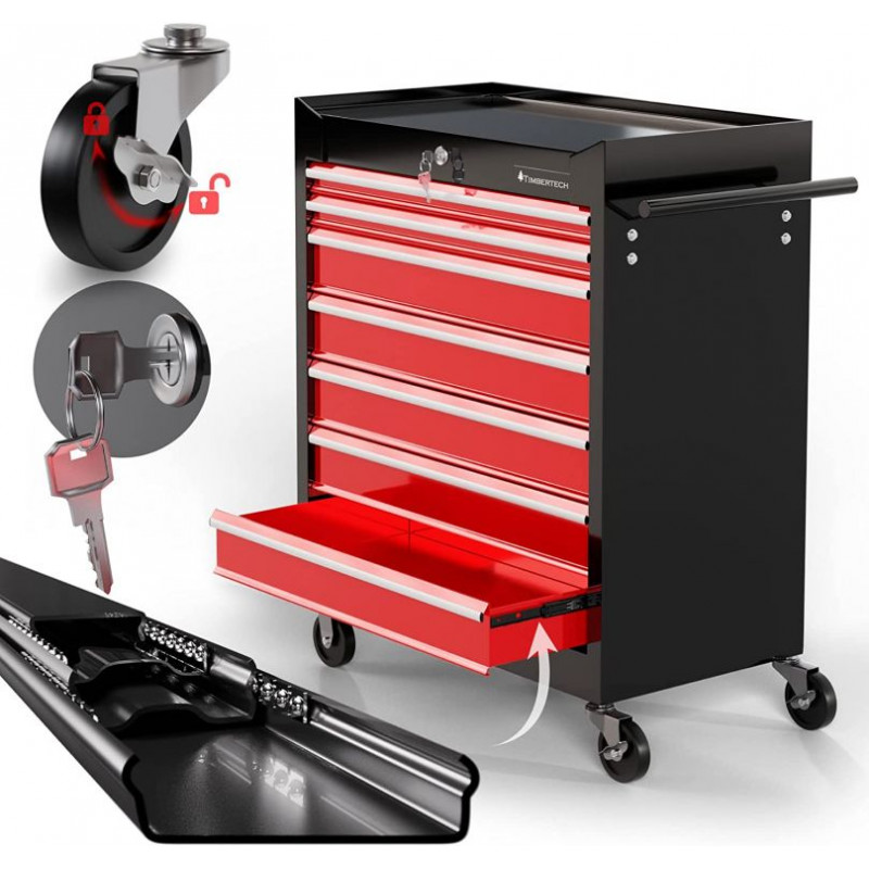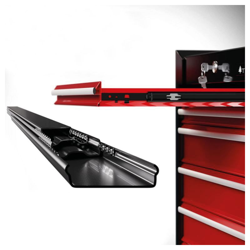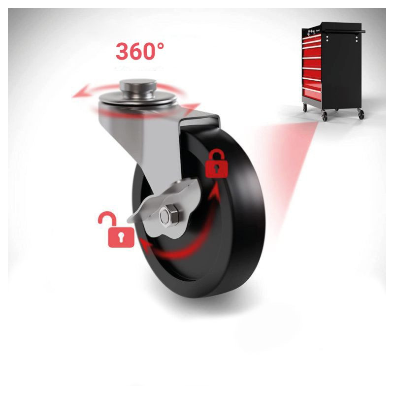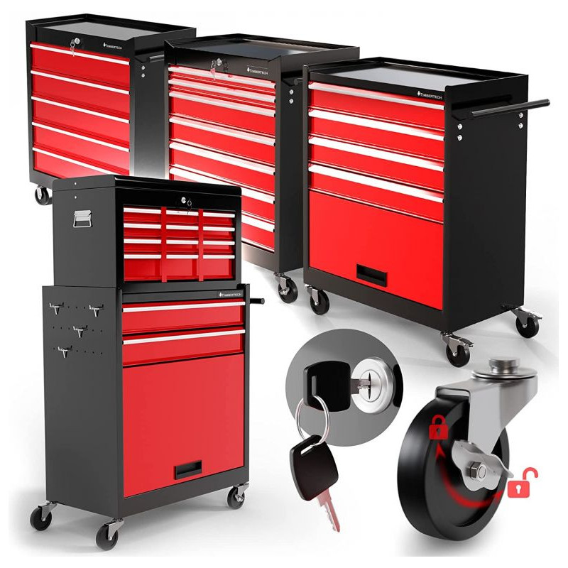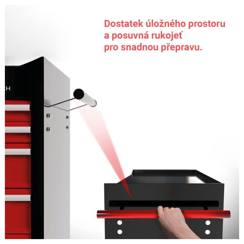 Vozík na náradie bol navrhnutý pre Vaše náradie, ktoré potrebujete mať vždy po ruke, a pomôže Vám udržať poriadok v garáži. Mobilný dielenský vozík je vybavený úložným priestorom a piatimi zásuvkami (s vložkami), ktoré ponúkajú dostatok úložného priestoru pre dôležité dielenské príslušenstvo. Tento montážny vozík má 4 riadiace kolesá, z ktorých 2 majú parkovacie brzdy, takže vozík môžete v garáži voľne premiestňovať, ale aj ho zafixovať na jednom mieste. Integrovaný centrálny zámok uzamkne všetky zásuvky naraz, takže ich počas prepravy nie je možné otvoriť a všetky Vaše veci sú bezpečne uložené v skrini na náradie.