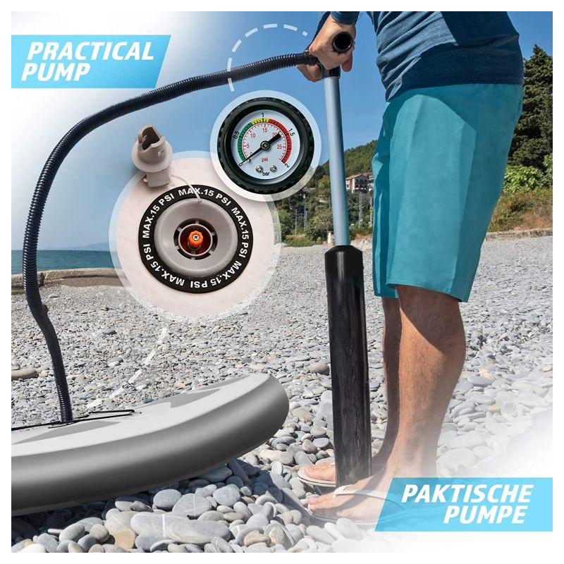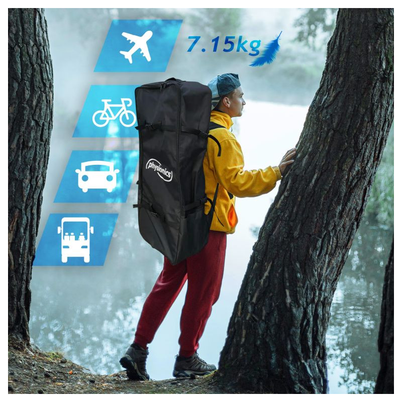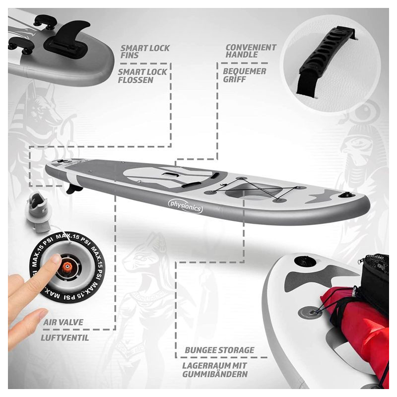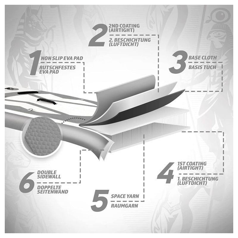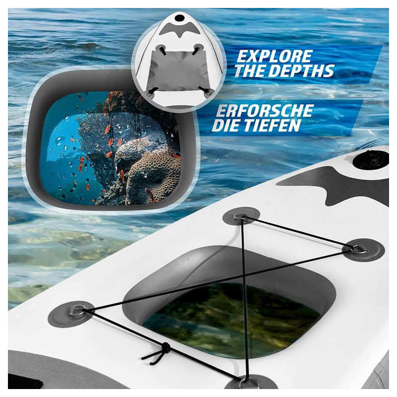 Paddleboard je vyrobený z materiálu PVC. Jeho hlavná doska je zosilnená technológiou Drop-Stitch. Drop-stitch je spojenie dvoch vrstiev tkaniny (PVC, Nitrilon) tisíckami a tisíckami vlákien z nylonu. Vďaka tomu nahusto umiestnené vlákna zaručujú, že materiál sa po nafúknutí nevyduje, ale drží tvar. Vďaka priehľadnému oknu môžete sledovať krásu podvodného sveta. Na doske tiež nájdete sedadlo, tri plutvy, praktickú rukoväť, protišmykovú a mäkkú EVA penu. Pre ľahké premiestňovanie máte k paddleboardu praktický batoh. Na rozdiel od mnohých iných modelov je tiež opatrený držiakom kamery na hornej strane dosky pre všetkých, ktorí chcú natáčať svoje dobrodružstvá. Dodáva sa s výsuvným dvojitým pádlom, bezpečnostným lanom na členok, ručnou pumpičkou, batohom, vodeodolnou taškou a súpravou na opravu.