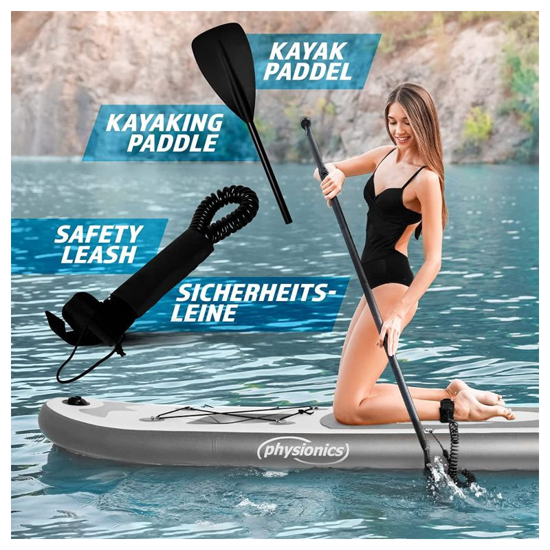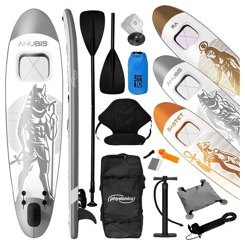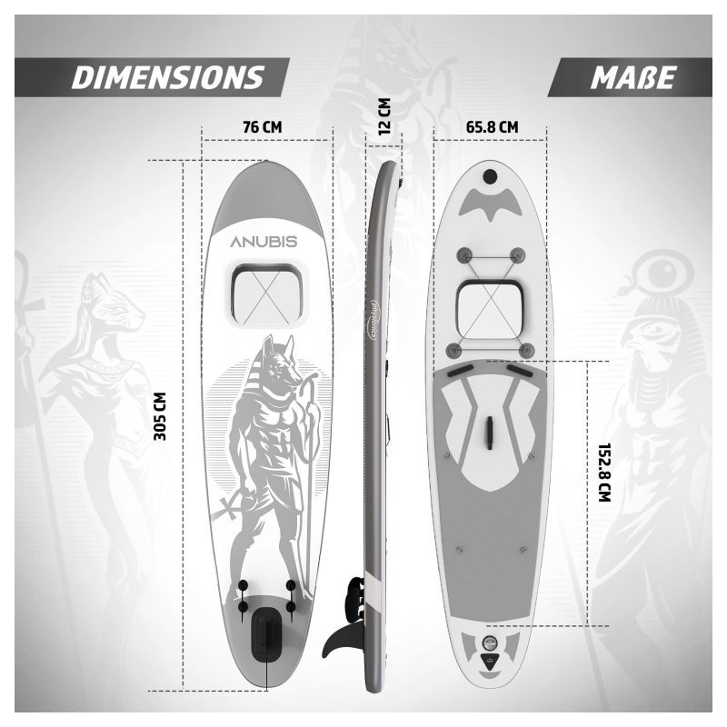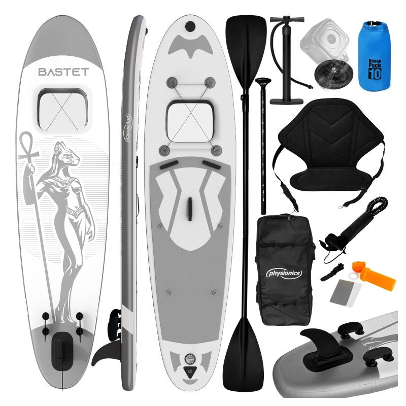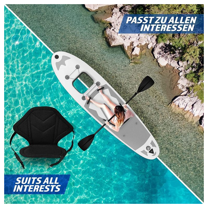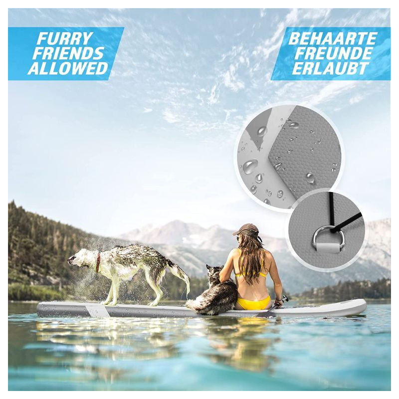 Paddleboard je vyrobený z materiálu PVC. Jeho hlavná doska je zosilnená technológiou Drop-Stitch. Drop-stitch je spojenie dvoch vrstiev tkaniny (PVC, Nitrilon) tisíckami a tisíckami vlákien z nylonu. Vďaka tomu nahusto umiestnené vlákna zaručujú, že materiál sa po nafúknutí nevyduje, ale drží tvar. Vďaka priehľadnému oknu môžete sledovať krásu podvodného sveta. Na doske tiež nájdete sedadlo, tri plutvy, praktickú rukoväť, protišmykovú a mäkkú EVA penu. Pre ľahké premiestňovanie máte k paddleboardu praktický batoh. Na rozdiel od mnohých iných modelov je tiež opatrený držiakom kamery na hornej strane dosky pre všetkých, ktorí chcú natáčať svoje dobrodružstvá. Dodáva sa s výsuvným dvojitým pádlom, bezpečnostným lanom na členok, ručnou pumpičkou, batohom, vodeodolnou taškou a súpravou na opravu.