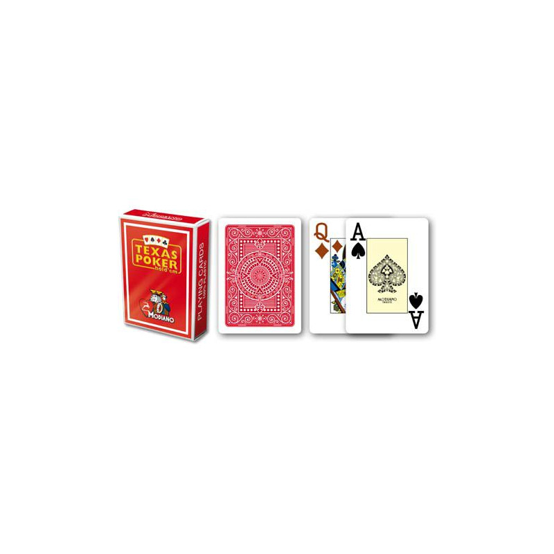 Kvalitné pokerové karty zo 100 % plastu obľúbenej značky Modiano. Karty majú klasický širokouhlý formát, sú dvojrohé - teda v protiľahlých rohoch je uvedená hodnota karty. Modiano karty sú obľúbené u pravidelných hráčov pre svoju vysokú životnosť a odolnosť. Vďaka zloženiu zo 100 % plastu vydržia tieto karty 100-krát viac hier ako karty papierové alebo karty iba s plastovým poťahom. Karty sú omývateľné, vodotesné a pýšia sa svojou dlhou životnosťou.