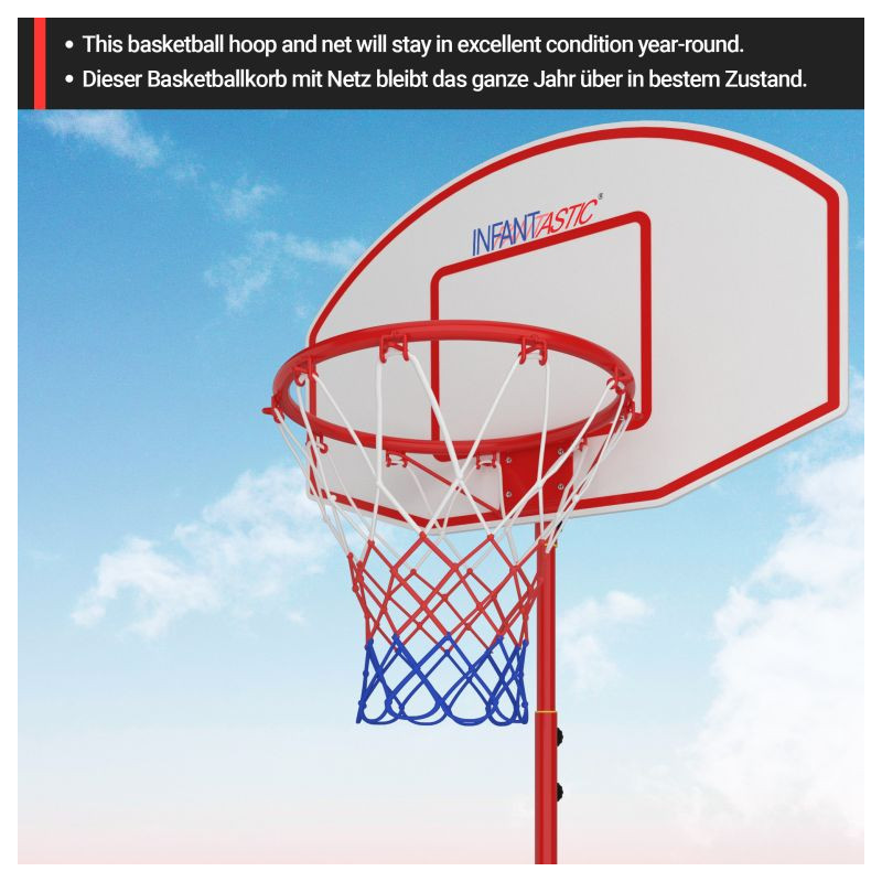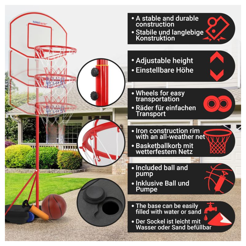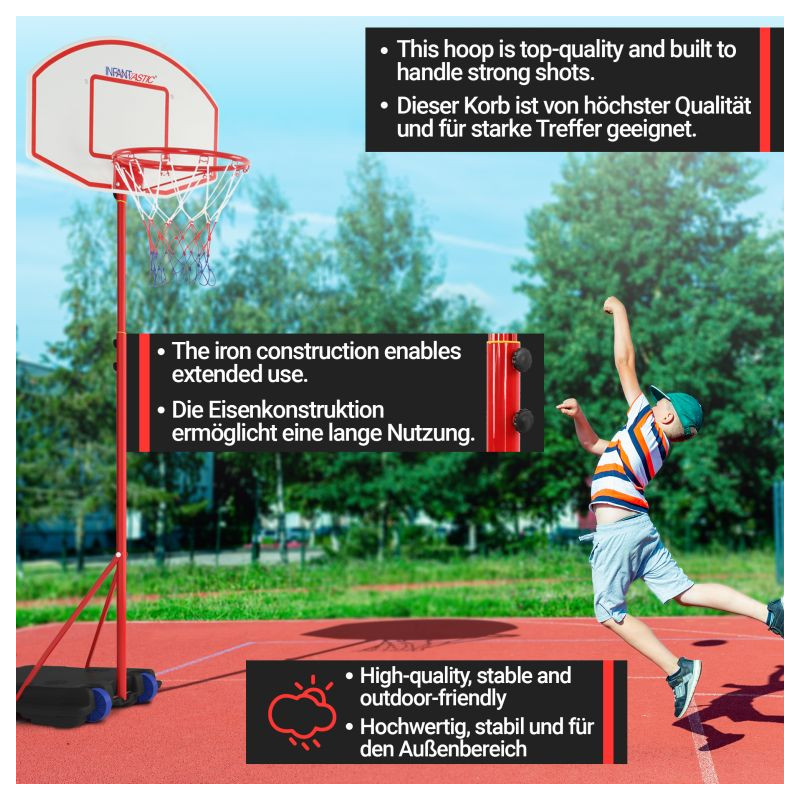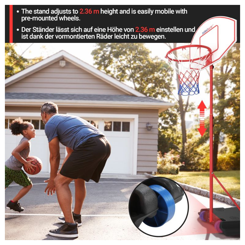 Tento basketbalový kôš má výškovo nastaviteľný stojan. Basketbalový kôš Vám ponúkne vynikajúcu stabilitu a ľahkú montáž. Behom okamihu ho zmontujete a jednoducho naplníte pieskom alebo vodou, náplň vylepší stabilitu stojana. Vďaka kolieskam je kôš mobilný.