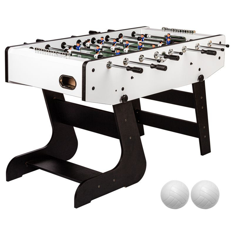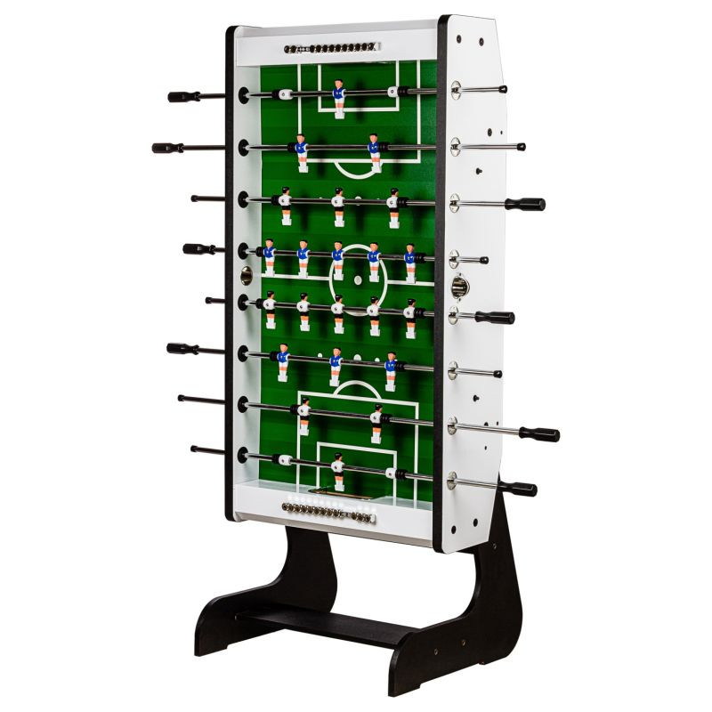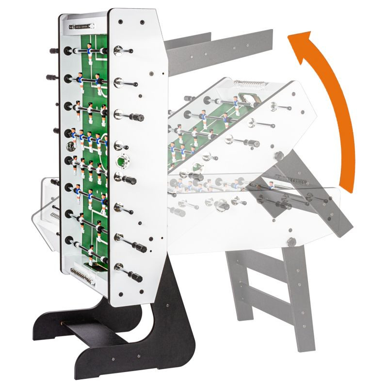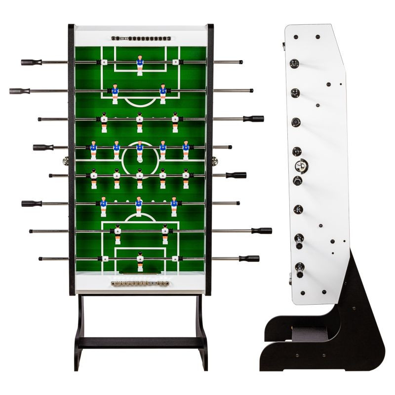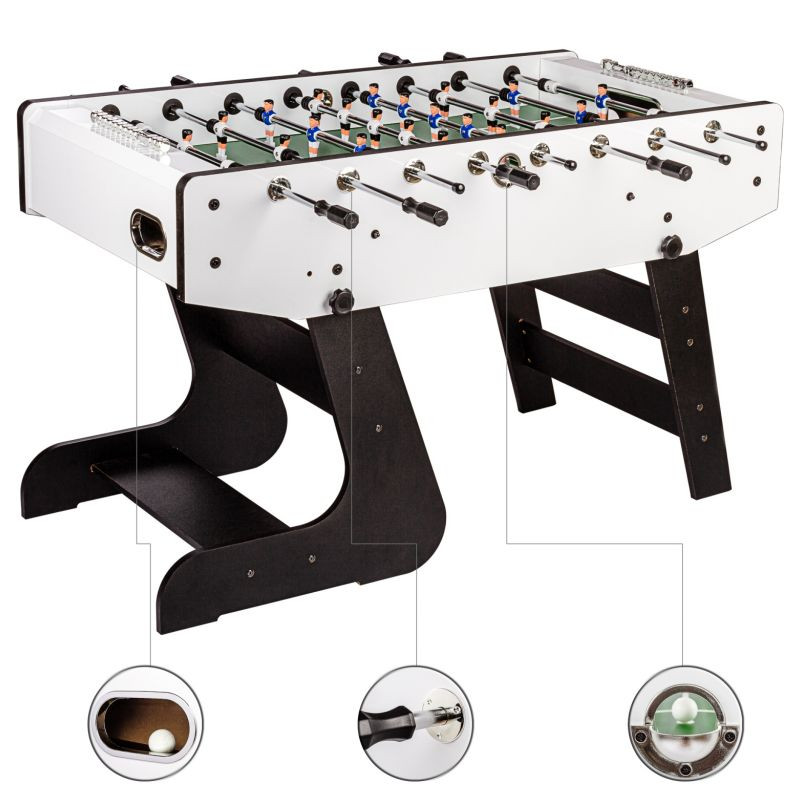 ⚽ Hlavným rysom stolného futbalu je skladací mechanizmus, pomocou ktorého ho môžete úsporne uložiť prakticky všade. Špeciálnu stabilitu zaisťujú stabilizačné tyče pod hracím poľom a krížové výstuhy na nohách. Vďaka kvalitným protišmykovým a ergonomicky tvarovaným držadlám je ovládanie loptičky hračka. Zdvihnuté rohy zaistia jej hladký priebeh, aby Vám nikdy neuviazla v rohoch. Figúrky sú skrutkované a maľované vo farbách modrá/biela a čierna/biela. Vďaka montážnym pokynom je futbalový stôl ľahko a rýchlo postavený a pripravený k hre.
