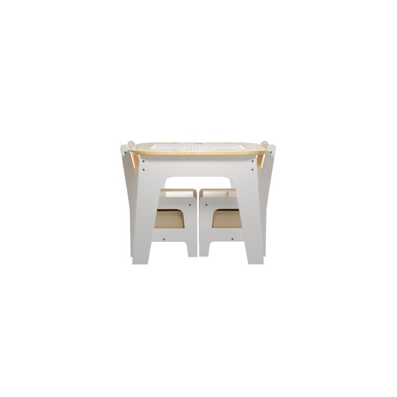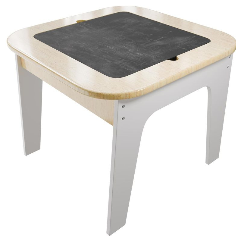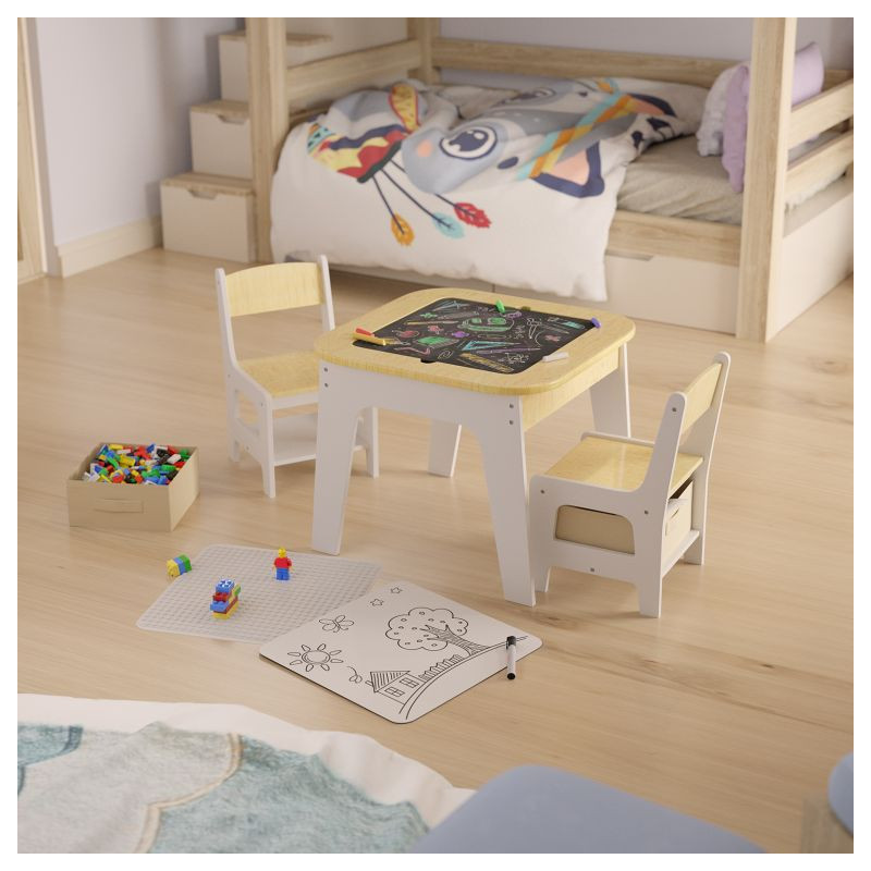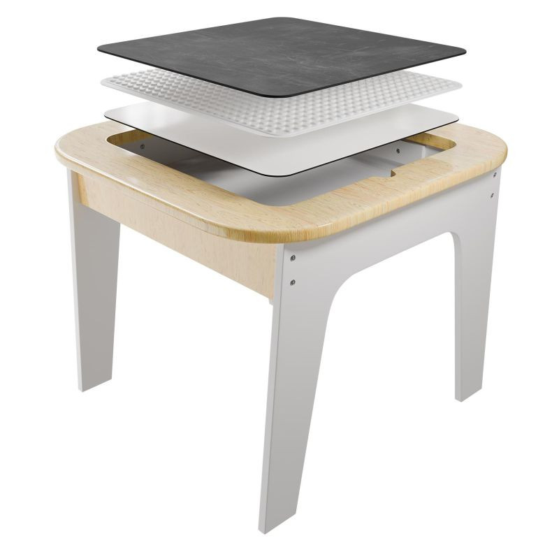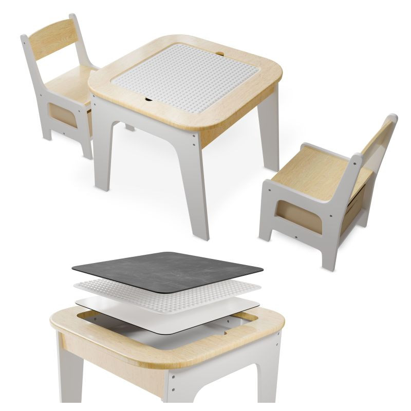 Robustná konštrukcia z prírodného dreva zaisťuje dlhú životnosť a bezpečnosť. Stôl s vymeniteľnými doskami ponúka rôzne herné možnosti – od kreslenia po stavanie kociek. Jednoduchá údržba a jednoduchá montáž poteší každého rodiča.
