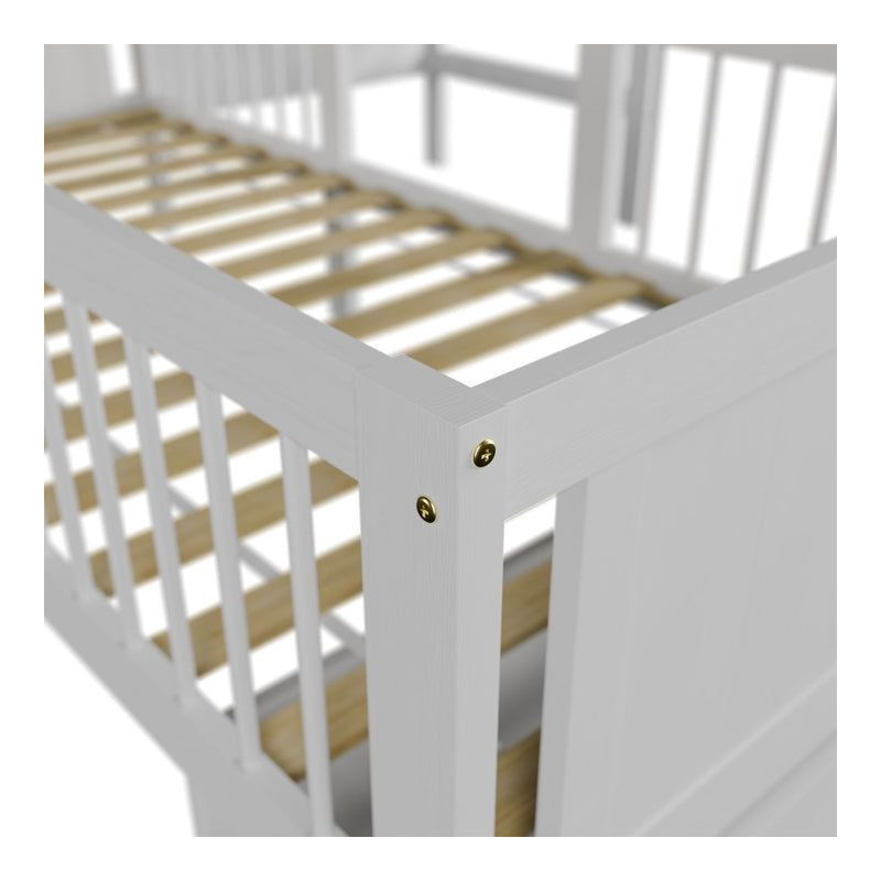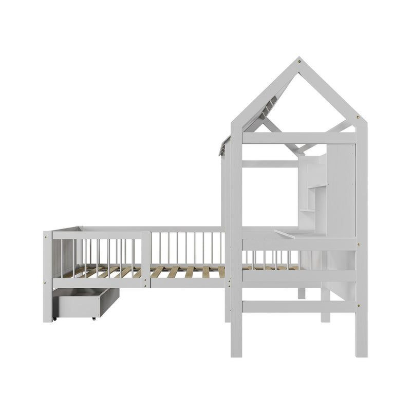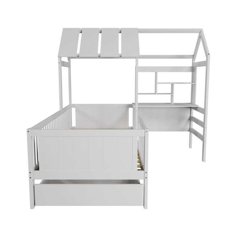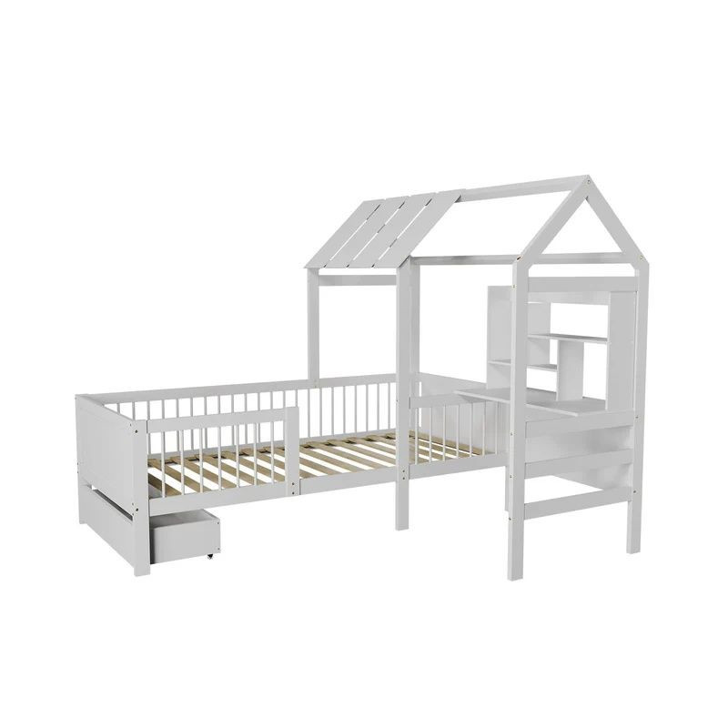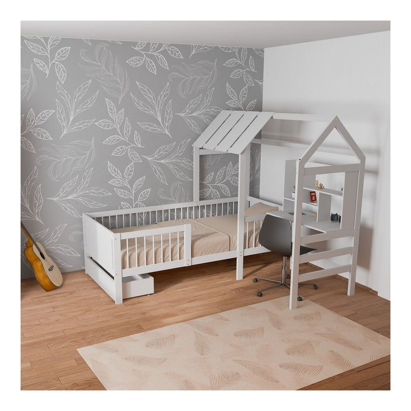 Biela detská posteľ Yari očarí každé dieťa aj rodičov svojim originálnym domčekovým vzhľadom. Vytvára bezpečné a inšpiratívne miesto na hranie, odpočinok aj učenie. Praktické zásuvky a písací stôl umožnia deťom mať všetko potrebné po ruke a zároveň udržať poriadok v izbe.