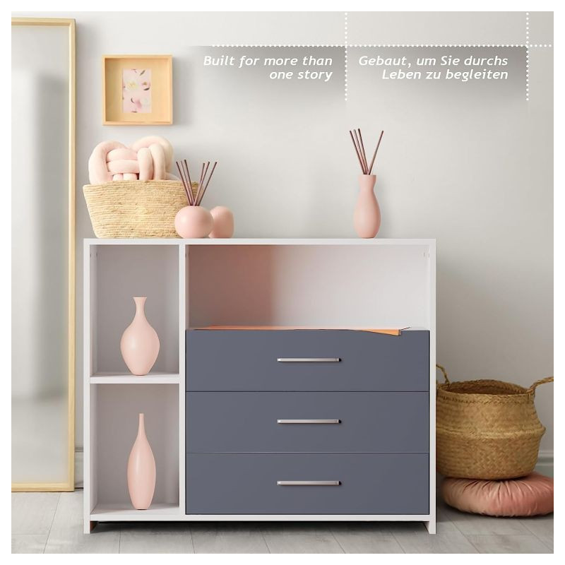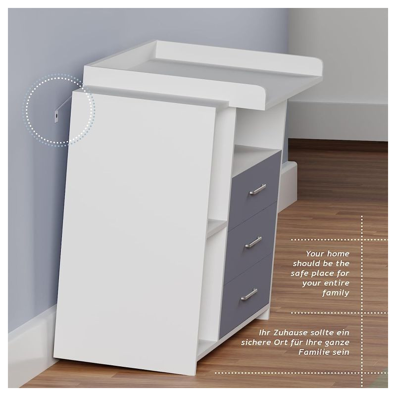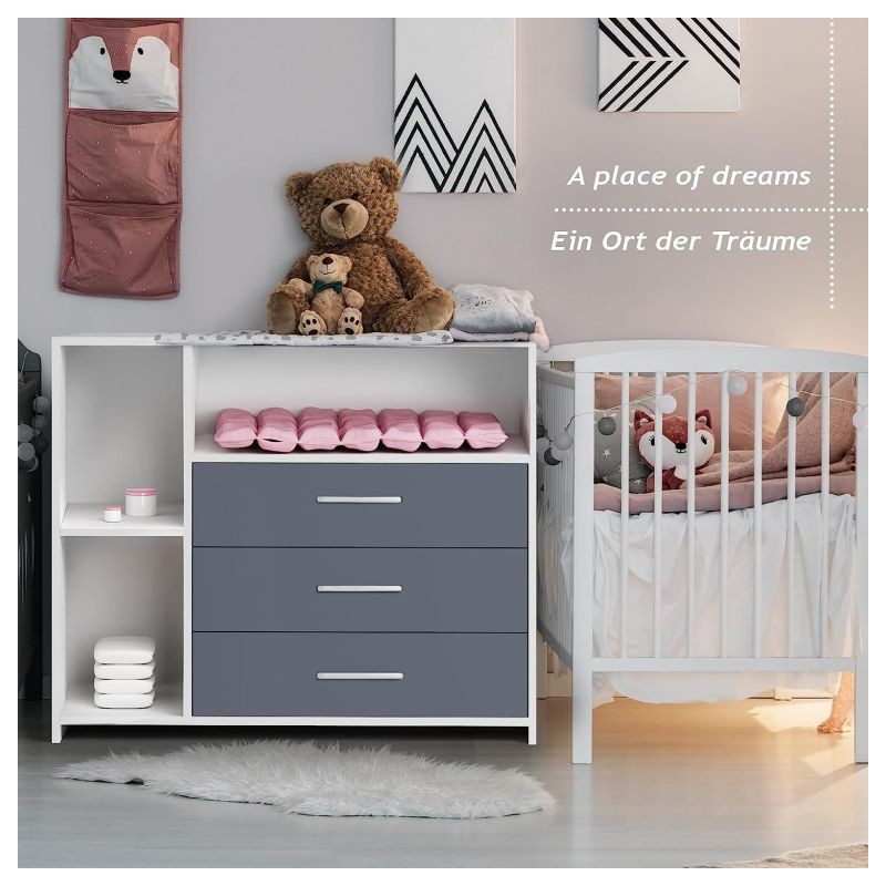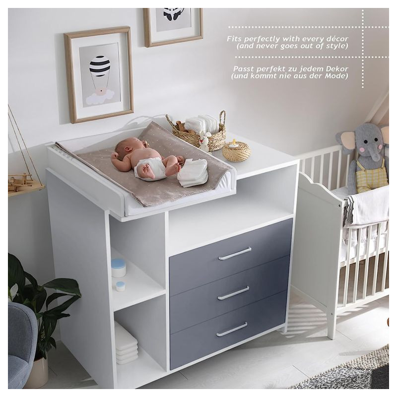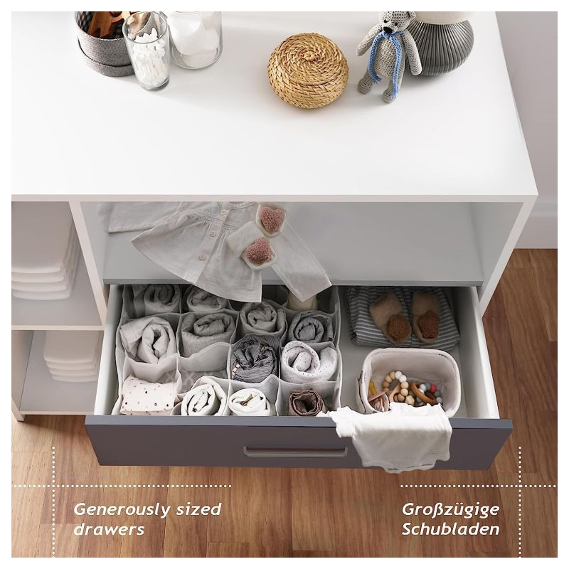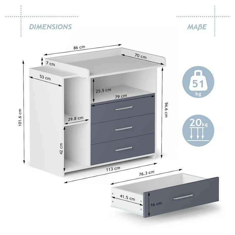 Prebaľovanie na veľkej prebaľovacej ploche - plienky, oblečenie, výrobky pre starostlivosť o dieťa a ďalšie veci na dosah zaistia Vám aj Vášmu dieťaťu pohodlie. Biela farba tohto detského nábytku sa ľahko hodí do rôznych štýlov interiérov. Akonáhle vaše dieťa prebaľovaciemu veku odrastie, môžete prebaľovaciu podložku tohto multifunkčného kusu nábytku jednoducho natrvalo odstrániť. Komoda tak môže byť používaná aj naďalej.