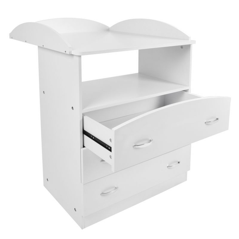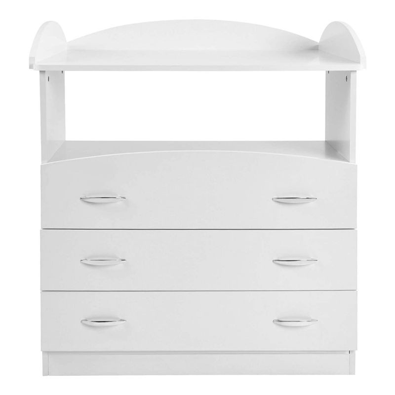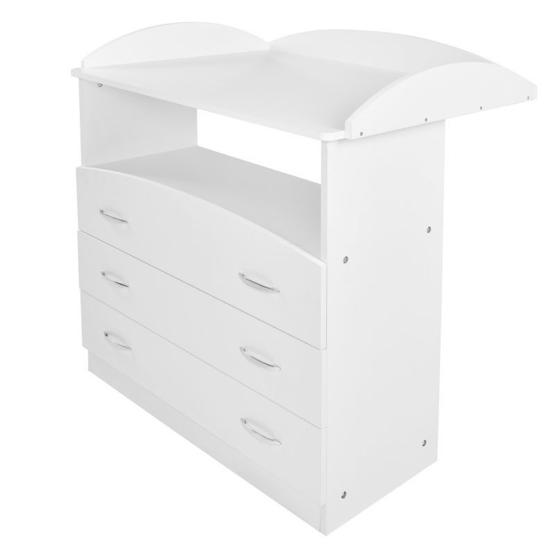 Prebaľovacia komoda s množstvom úložného priestoru. Moderná prebaľovacia komoda sa vyznačuje jednoduchým dizajnom a dostatkom úložného priestoru. V troch zásuvkách a otvorenej priehradke je priestor na plienky, oblečenie, výrobky pre starostlivosť a všetko ostatné, čo by malo byť pri každodennej výmene plienok vždy po ruke. Plienky môžete pohodlne meniť na veľkej prebaľovacej ploche. Biela farba sa hodí do každej detskej izby a možno ju kombinovať s najrôznejším nábytkom. Túto nábytkovú jednotku je možné neskôr použiť ako komodu.