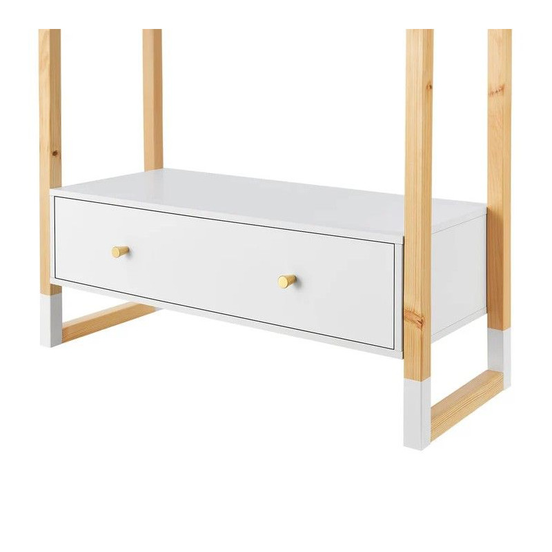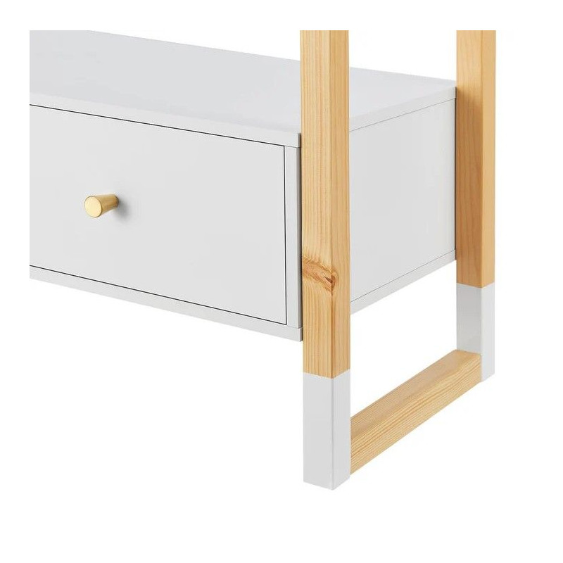 Kombinácia borovicového dreva a bielej MDF zaisťuje pevnosť a odolnosť. Veľká zásuvka je praktická na uloženie doplnkov, hračiek alebo obuvi. Montáž je intuitívna a údržba veľmi jednoduchá.