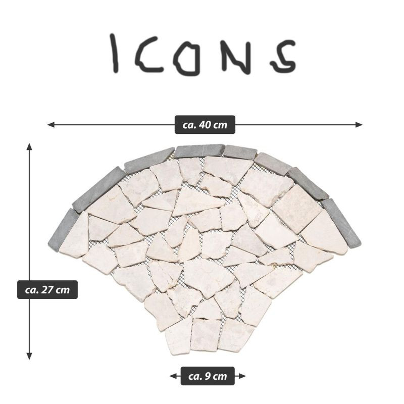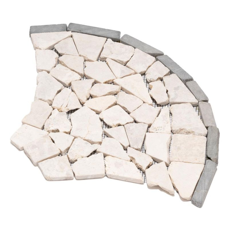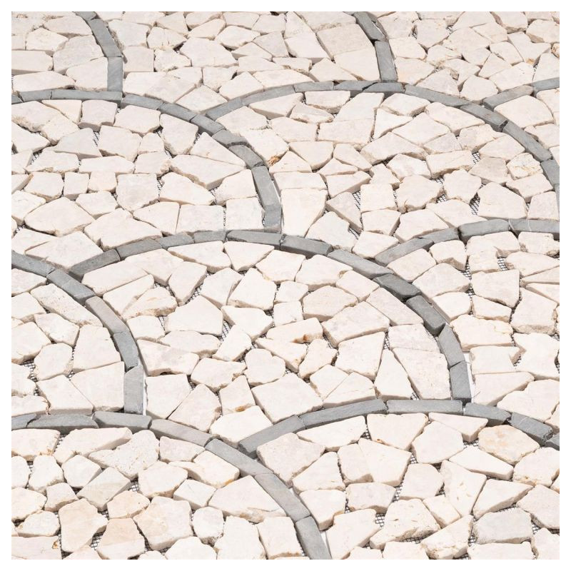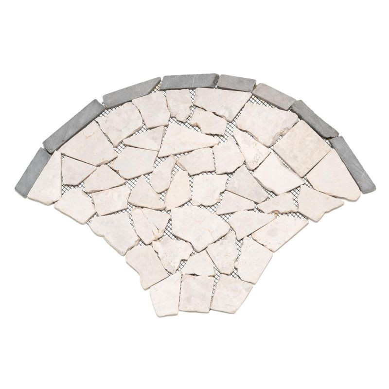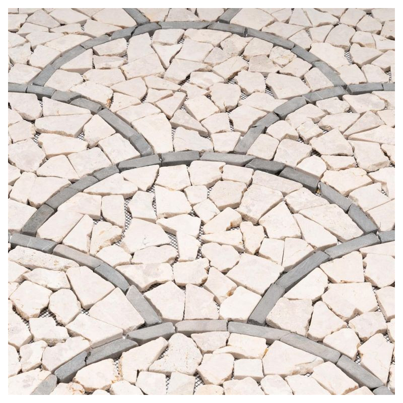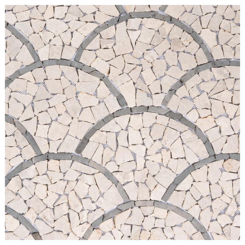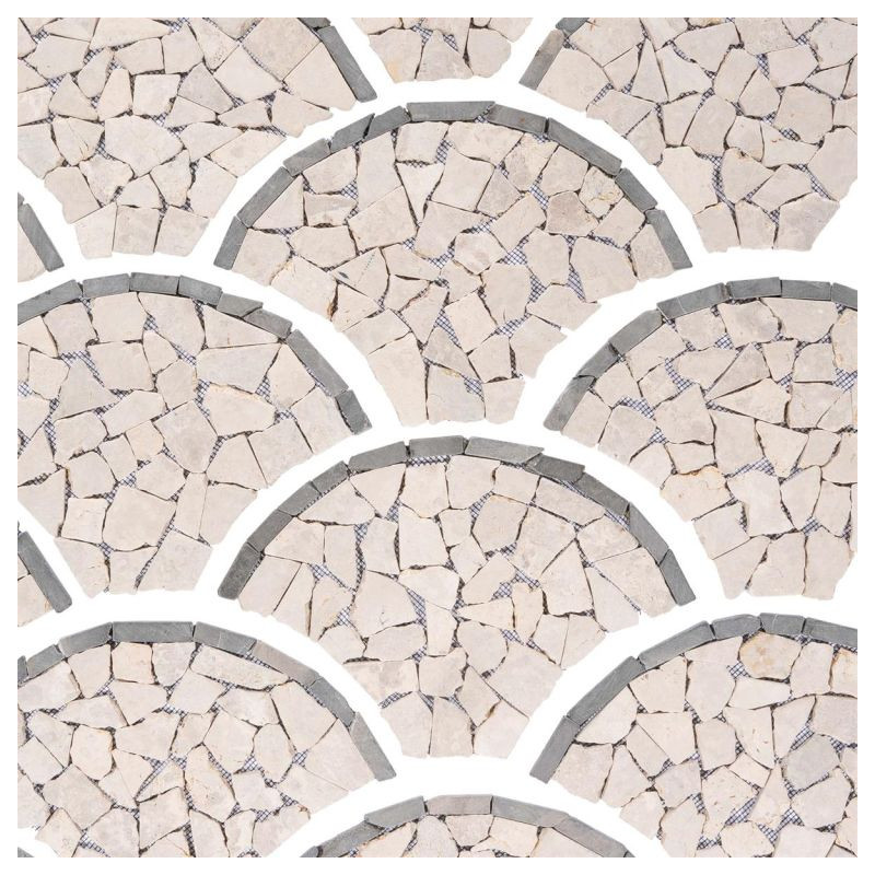 Táto mozaika so svojimi jemnými prírodnými farbami vytvorí útulnú atmosféru vo vašej kúpeľni, kuchyni, chodbe, terase alebo vchode do domu. Vašej kreativite sa medze nekladú. Elegantná dlaždica z prírodného kameňa so vzorom vejára alebo rybích šupín vytvára mimoriadny vzhľad. Ručne sa lepí na špeciálnu podložku pre jednoduchú inštaláciu. Lámaná mozaika je vyrobená z leštených prírodných kameňov a hrany sú zaoblené. Okrúhle lámané mozaikové kamienky krémovej farby sú lepené na sieť. Pri vhodnom spracovaní je mozaika z prírodného kameňa vhodná ako obklad alebo dlažba a je možné ju použiť v interiéri aj exteriéri.