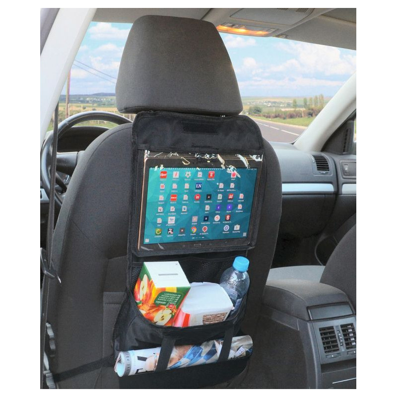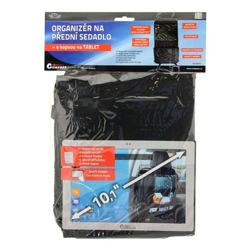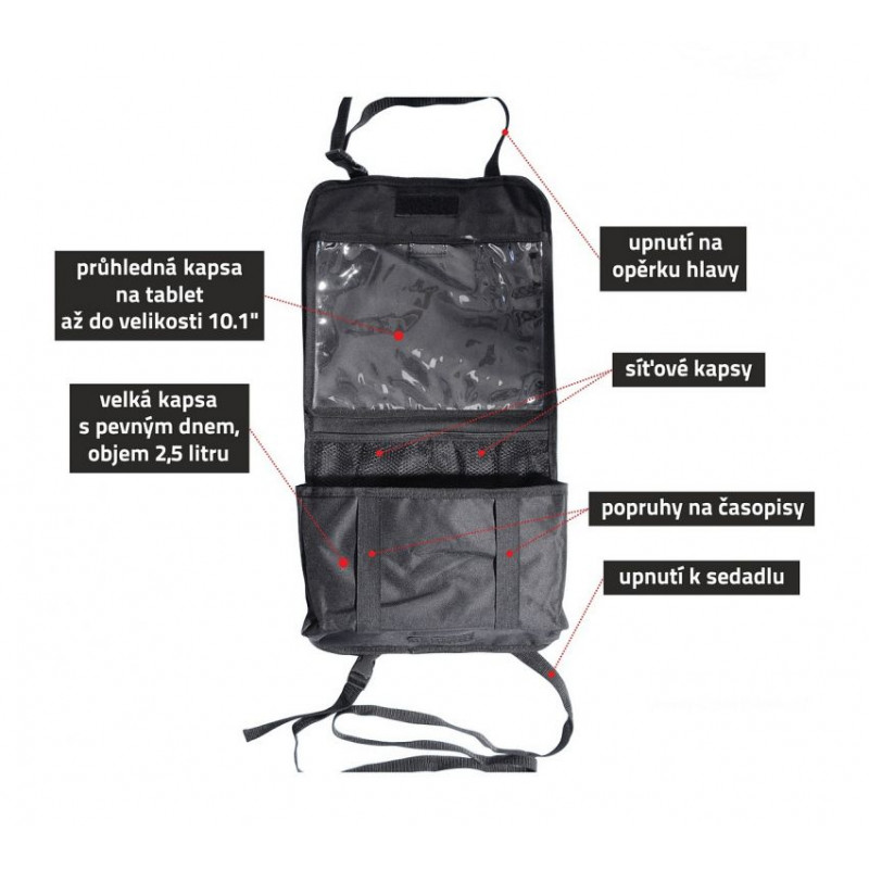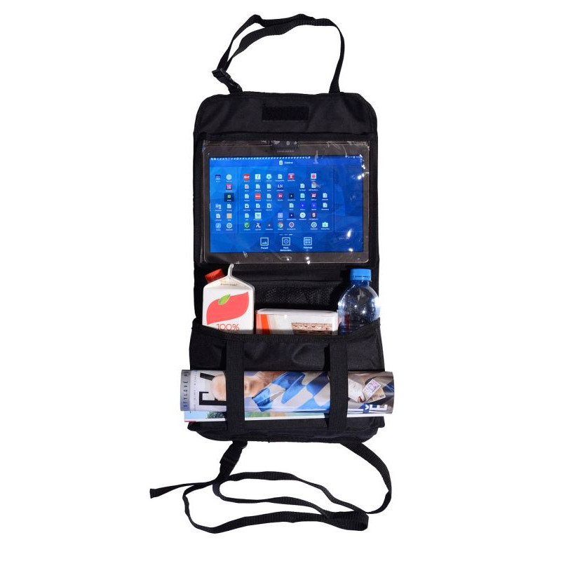 Organizér je vybavený celým radom vreciek, a jedným veľkým priehľadným vreckom (25 x 18 cm) do ktorého je možné zasunúť tablet až do veľkosti 10.1". Fólia na vrecku umožňuje bezproblémové ovládanie dotykových obrazoviek.