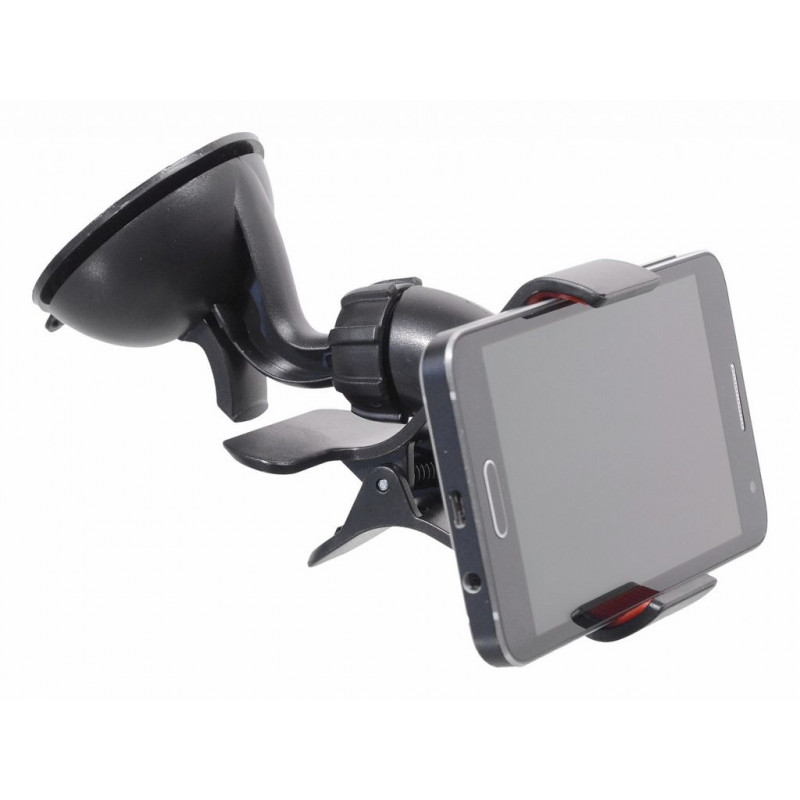 Držiak na telefón s extra silnou prísavkou a klipsom na uchytenie telefónu či navigácie až do šírky (alebo výšky) 10 cm. Telefón v klipse pevne drží pomocou silnej pružiny, a proti pohybu je zaistený pomocou protišmykovou vrstvou vo vnútri klipsu.