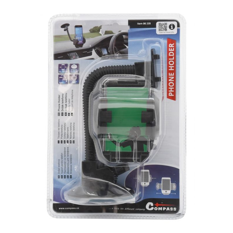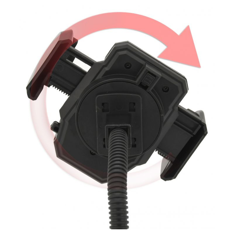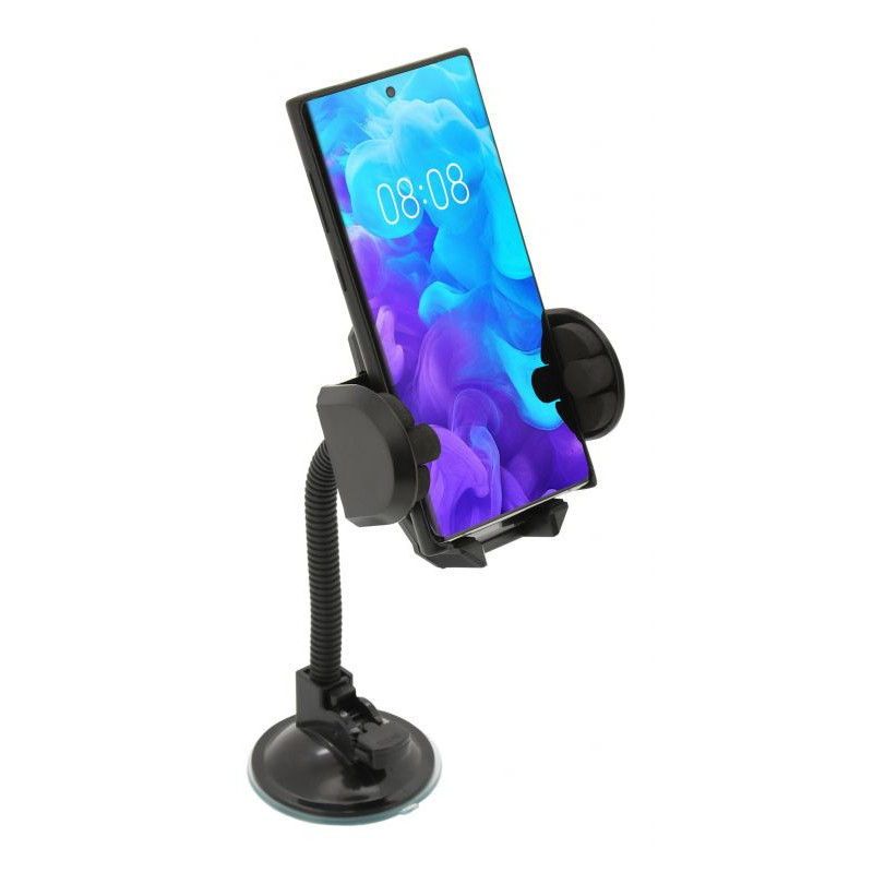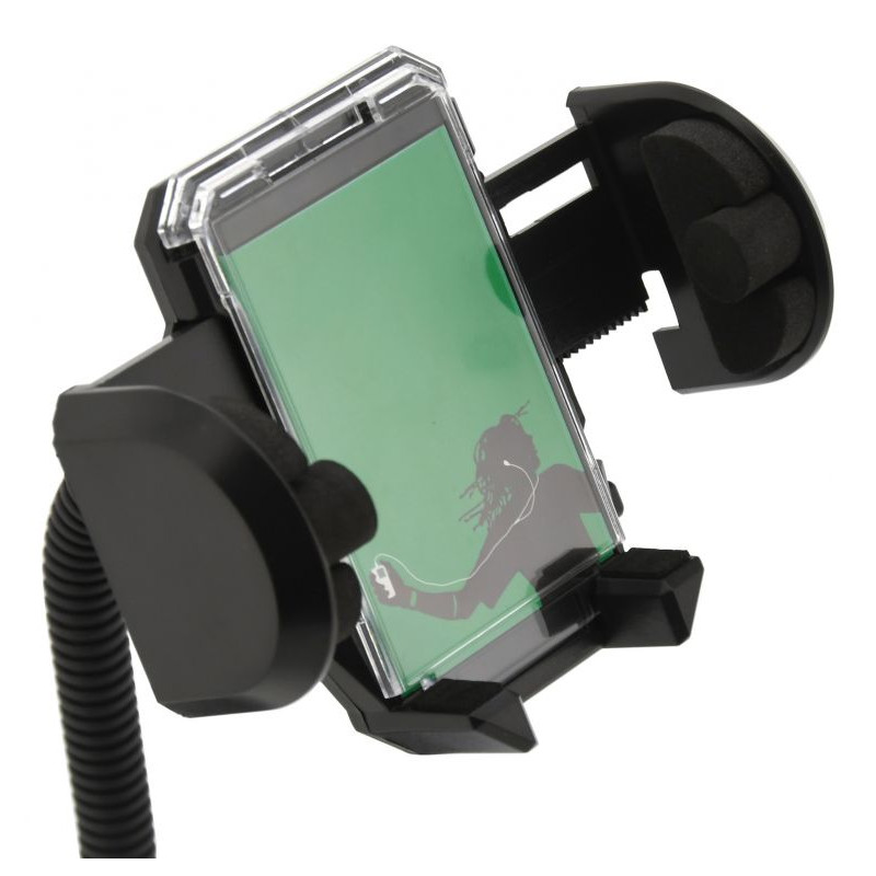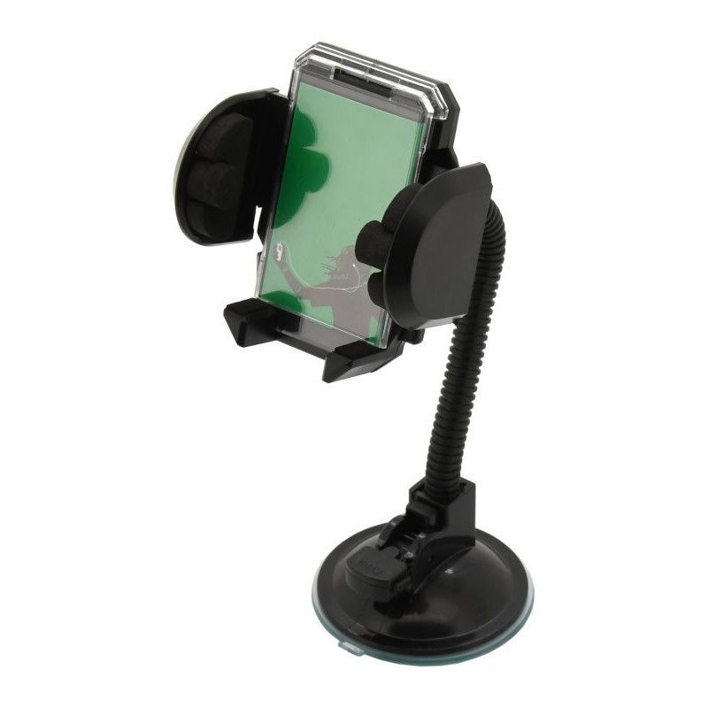 Držiak s extra silnou prísavkou, na uchytenie telefónu. Šírku je možné zväčšiť stlačením bočného tlačidla, telefón sa potom umiestni do držiaka a ten sa potom zaistí stlačením čeľustí. Vďaka uzamykateľnému otáčaniu o 360 ° a flexibilnému ramenu držiaka, je možné ľahko nastaviť vhodnú polohu telefónu. Telefón v klipse pevne drží vďaka dômyselnému mechanizmu, proti poškriabaniu je upnutý telefón chránený penovými prvkami.