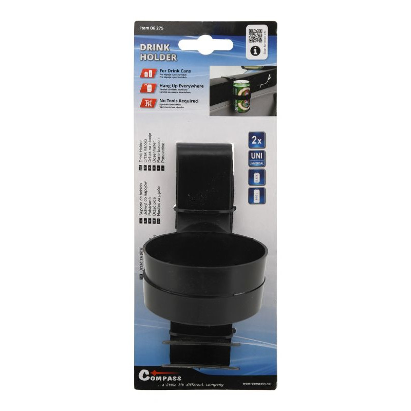 Sada dvoch praktických plastových držiakov na nápoje v plechovkách s objemom 0,33 a 0,5 l. Držiaky sú vyrobené z pružného plastu, zavesená časť je zozadu vystužená, aby bola zabezpečená vyššia pevnosť. Na montáž nie je potrebné žiadne náradie, držiaky sú vhodné na umiestnenie za tesnenie bočných okien dverí vozidiel.