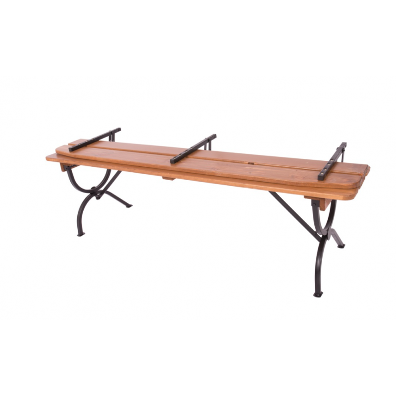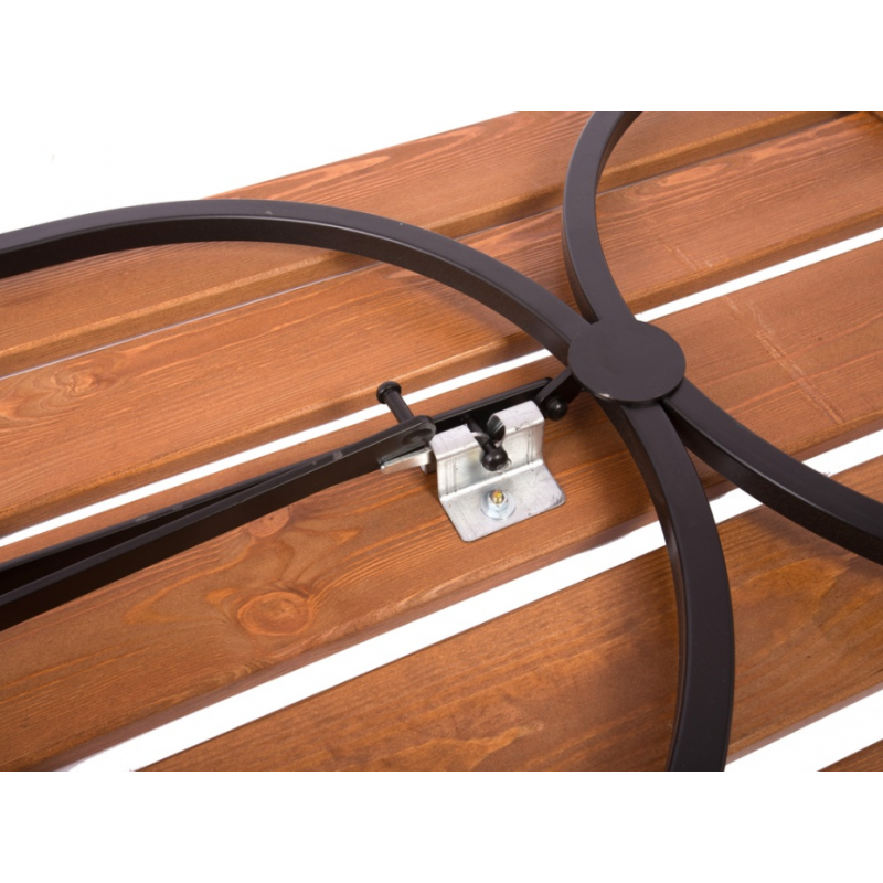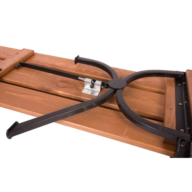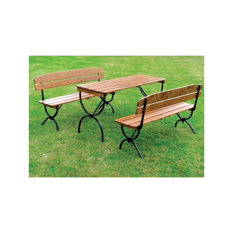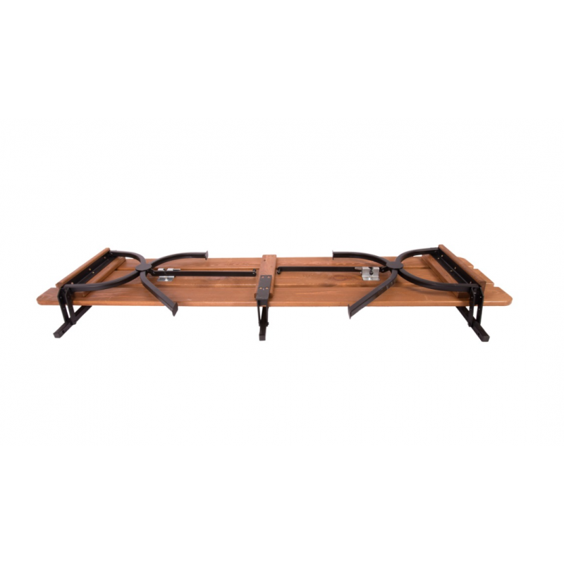 Záhradná drevená zostava, ktorá zahŕňa 2 lavice + stôl. Set je vyrobený z borovicového dreva s kovovou podnožou. Drevo je impregnované v dubovej farbe + lakované. Veľkou výhodou tohto setu je možnosť zloženia podnože a tak je jednoduchšie uloženie , či manipulácia s ním. Certifikát FSC zákazníkom zaručuje, že drevo, z ktorého je výrobok zhotovený, je kvalitné a zdravé.
