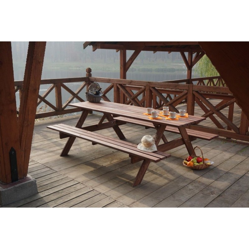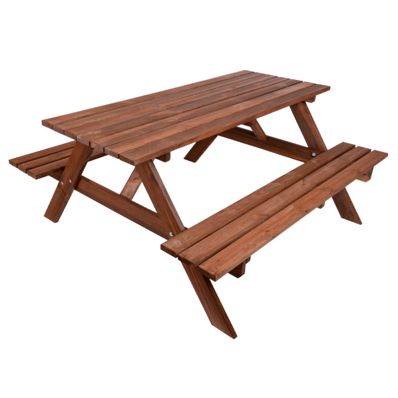 Záhradná zostava PIKNIK je zhotovená z kvalitného borovicového dreva. Drevo je impregnované do gaštanovej farby. Zostava sa skladá zo stola a dvoch lavíc, ktoré sú pripojené k stolu. Certifikát FSC zaručuje, že použité drevo pochádza zo šetrne obhospodarovaných lesov, v ktorých sú dodržiavané prísne ekologické a sociálne požiadavky.