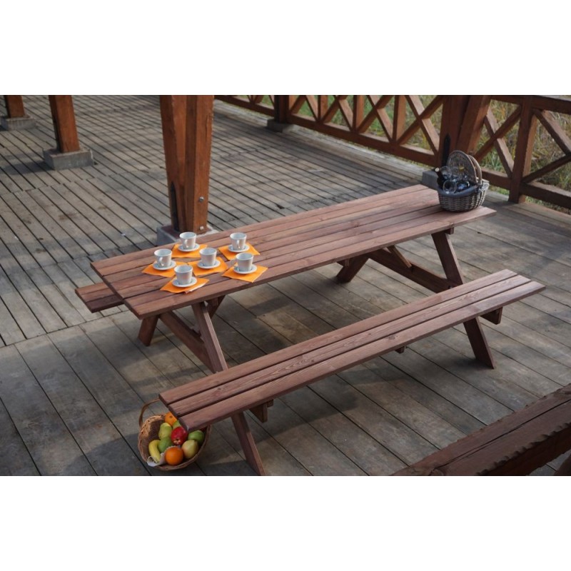 Zahradní sestava PIKNIK je zhotovena z kvalitního borovicového dřeva. Dřevo je impregnované do kaštanové barvy. Sestava se skládá ze stolu a dvou lavic, které jsou připojeny ke stolu. Certifikát FSC zákazníkům zaručuje, že dřevo, z něhož je výrobek zhotoven, je kvalitní a zdravé