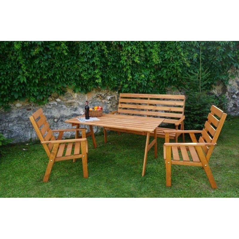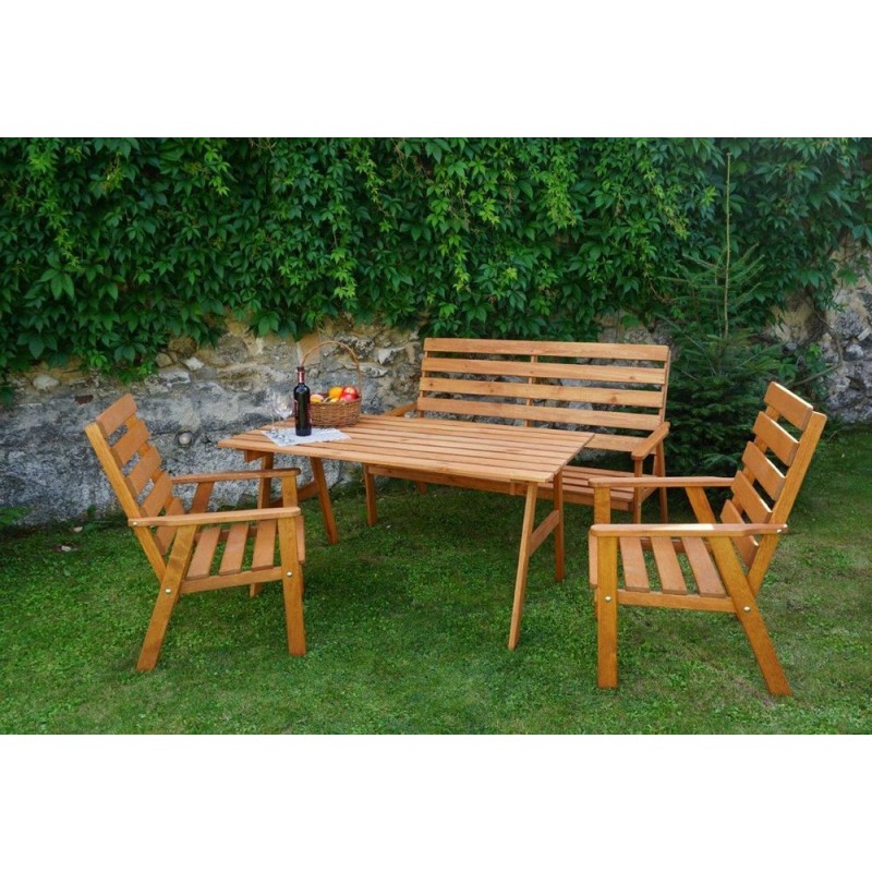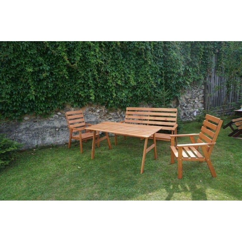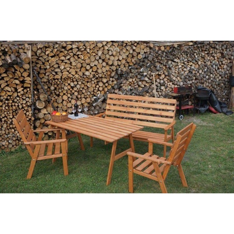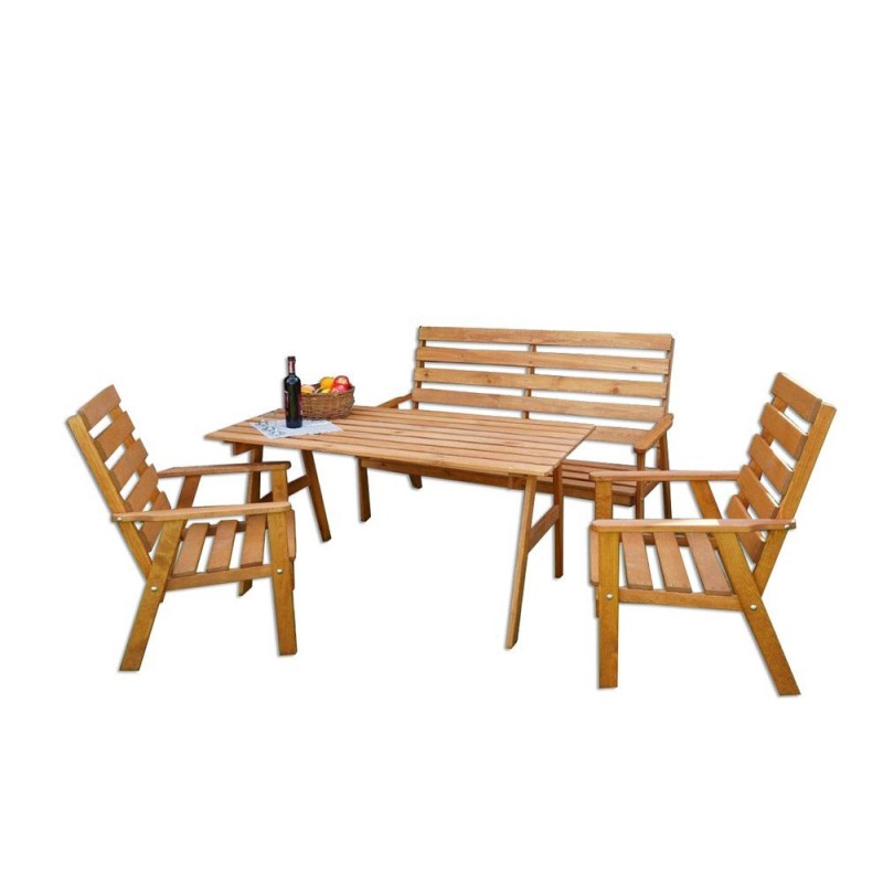 Zahradní set z borovicového dřeva. Set se skládá z lavice, dvou křesel a stolu.