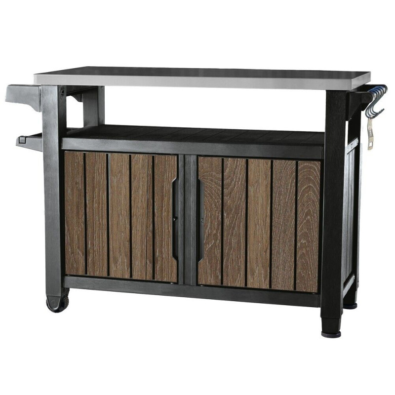 Robustná konštrukcia z plastu a nerezu zaručuje dlhú životnosť aj jednoduchú údržbu. Jednoduchá manipulácia vďaka kolieskam a praktická rukoväť s háčikom na uterák ocení každý, kto si potrpí na poriadok a efektivitu pri grilovaní.