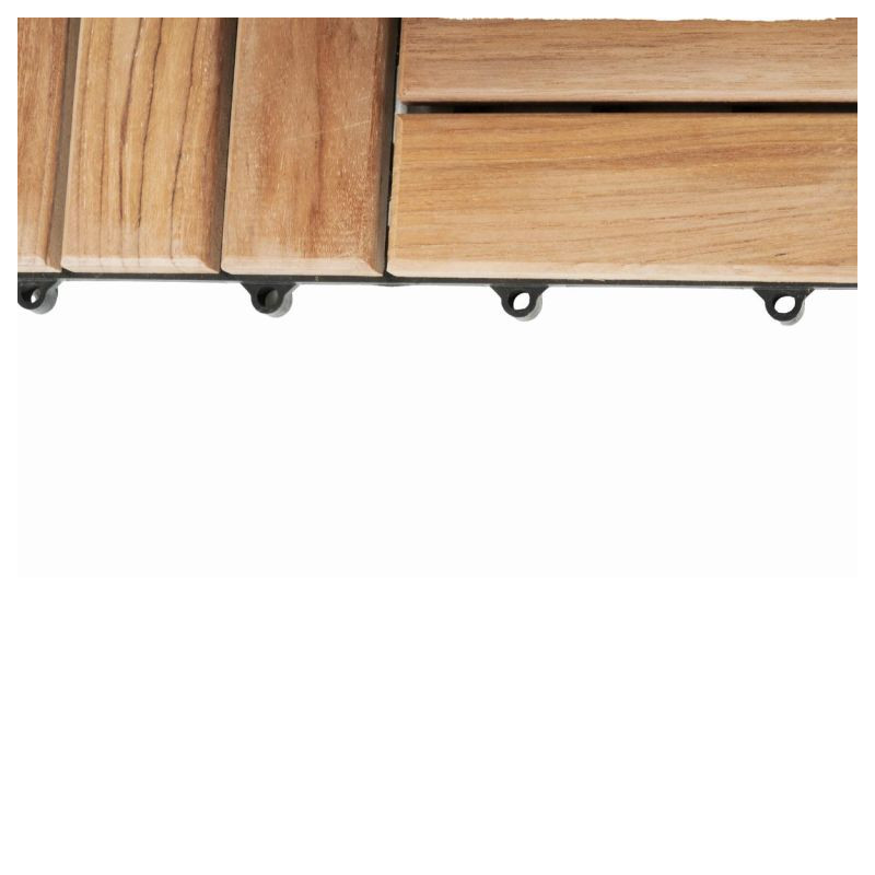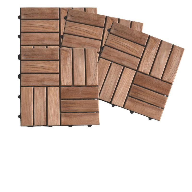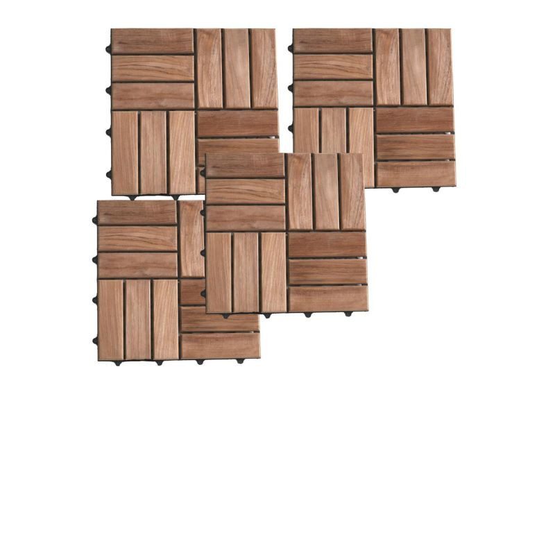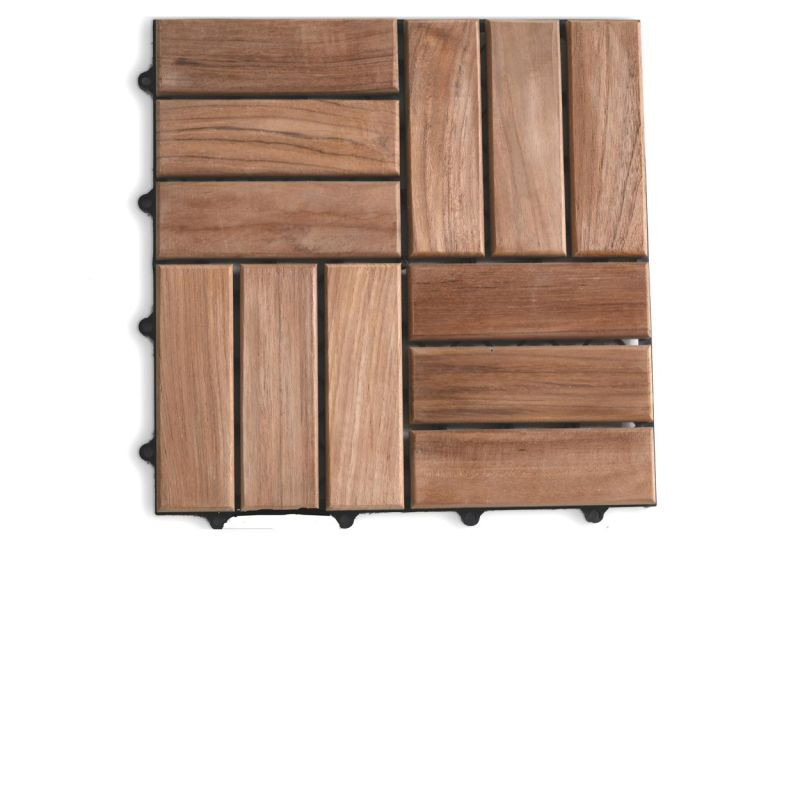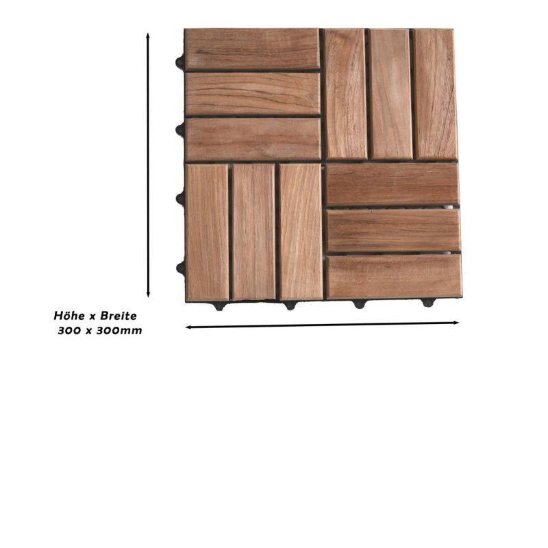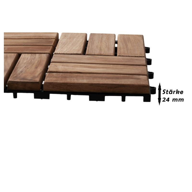 Zažite prirodzenú krásu a robustnosť teaku s našimi dlaždicami. Každá dlaždica má rozmery 30 x 30 x 2,5 cm a bez problémov zapadne do vašich vonkajších alebo vnútorných priestorov. Vďaka jednoduchému zaklapávaciemu systému je možné dlaždice pokladať bez námahy a bez náradia, čo znamená, že behom okamihu vytvoríte štýlový povrch podlahy s dlhou životnosťou. Užite si hrejivý, prirodzený vzhľad teaku a premeňte svoje obytné alebo vonkajšie priestory na štýlovú oázu relaxácie.