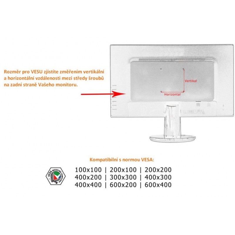 Tento nástenný držiak je kompatibilný s týmito normami VESA: 75 x 75 / 100 x 100 / 200 x 100 / 200 x 200 / 400 x 200 / 300 x 300 / 400 x 300 / 400 x 400 / 600 x 200 / 600 x 400.