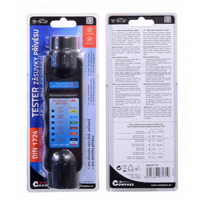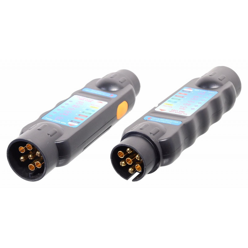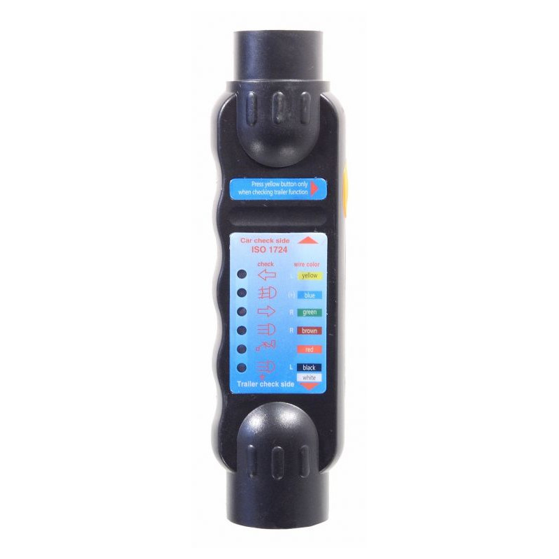 Tester s LED diódami na overenie všetkých funkcií osvetlenia pre zásuvku ťažného zariadenia vozidla a pre zástrčku prívesu. Otestuje všetky 7 pólové zásuvky a zástrčky; pomocou adaptérov (nie je súčasťou balenia) aj všetky 13 pólové zásuvky a zástrčky v 7 pólovej funkcii. LED kontrolky zobrazia nefunkčné spojenie.