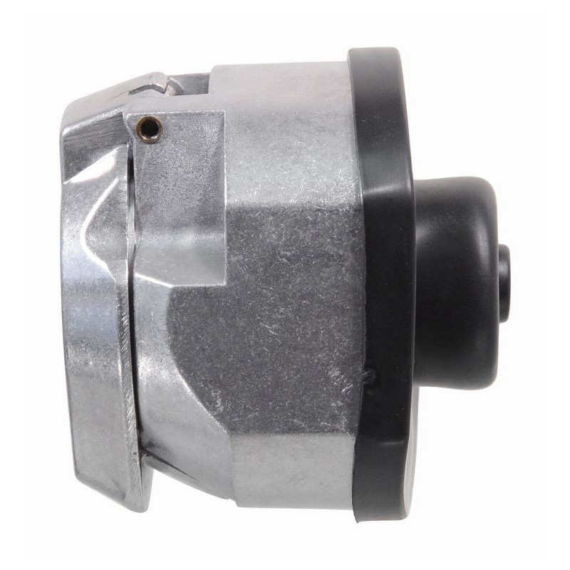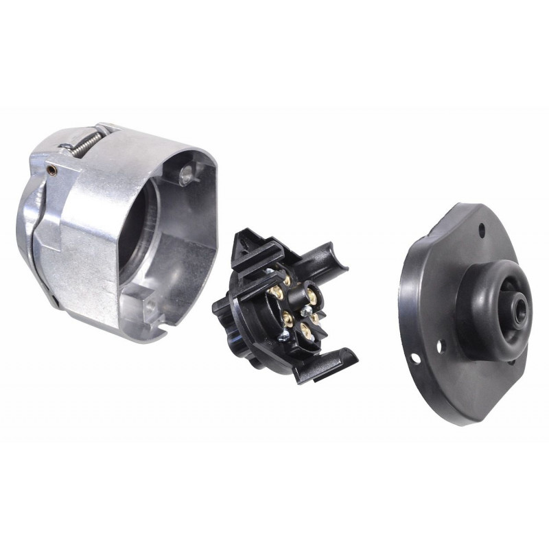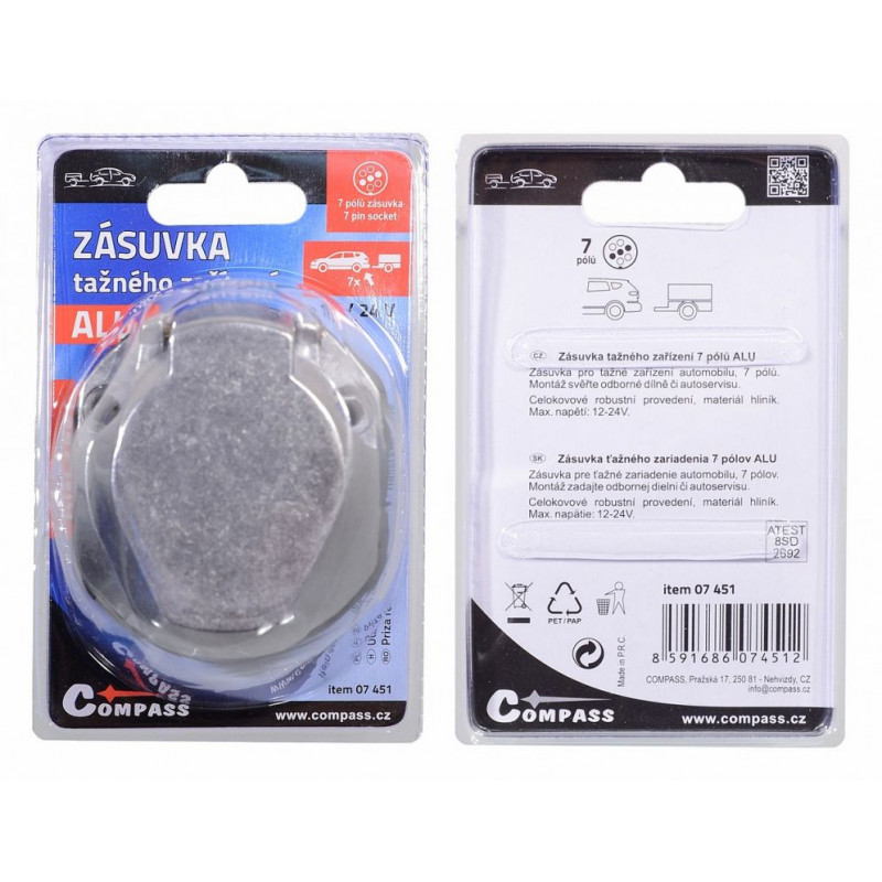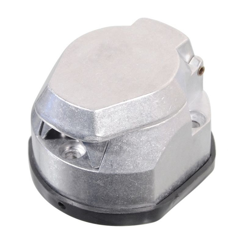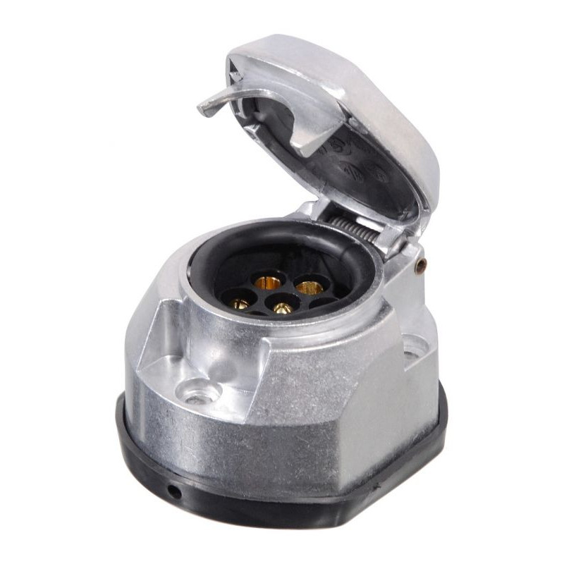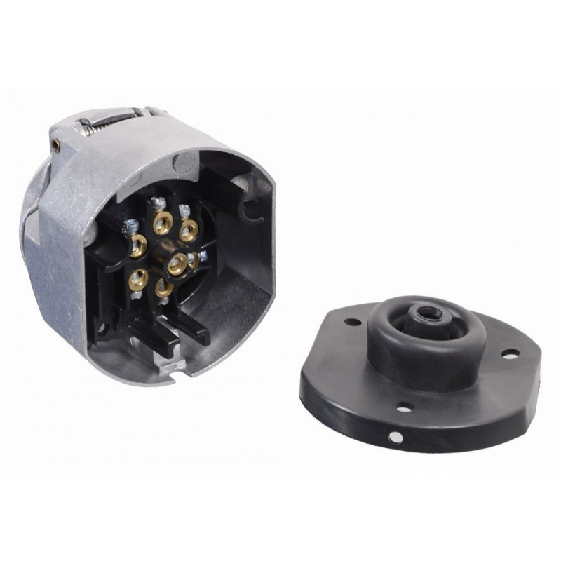 Celokovová ALU zásuvka pre ťažné zariadenie automobilu podľa normy DIN 1724, 7 pólov. Zásuvka je vybavená ako tesnením na montážnej strane, tak aj tesnením, priamo vo vnútri konektora, takže zaisťuje ešte dôkladnejšiu vodeodolnosť. Ďalej je vybavená kovovým krytom, ktorý sa automaticky (pružinou) uzatvára.