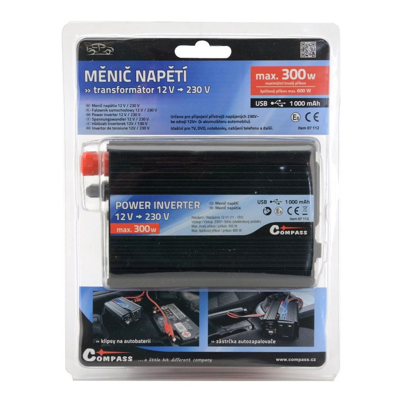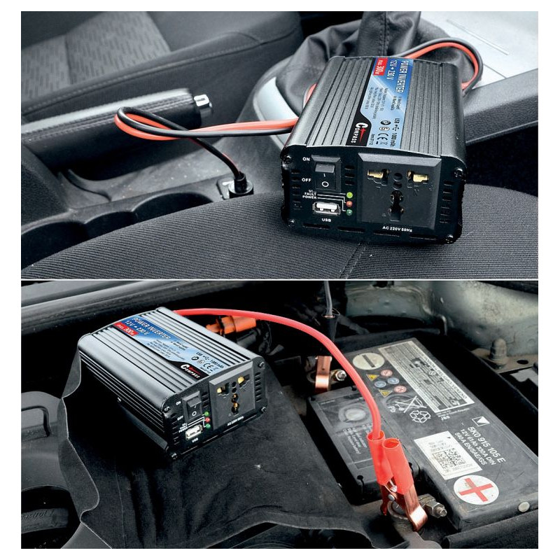 Pripojenie napájacieho napätia je riešené zástrčkou do zásuvky automobilového zapaľovača 12 V alebo pomocou klipsov z akumulátora 12 V. Výstup meniča je vybavený bežnou zásuvkou 230 V európskeho typu pre spotrebiče bez zemniaceho kolíka tj "dvojkolíková" zástrčka. Navyše je k dispozícii USB zásuvka vhodná pre MP3 prehrávače, mobilné telefóny a ďalšie zariadenia, ktoré sa nabíjajú či napájajú bežným USB zdrojom 5 V až do príkonu 1000 mA. Ďalej je menič vybavený vypínačom, kontrolkami prevádzky a signalizáciou nežiaducich stavov.