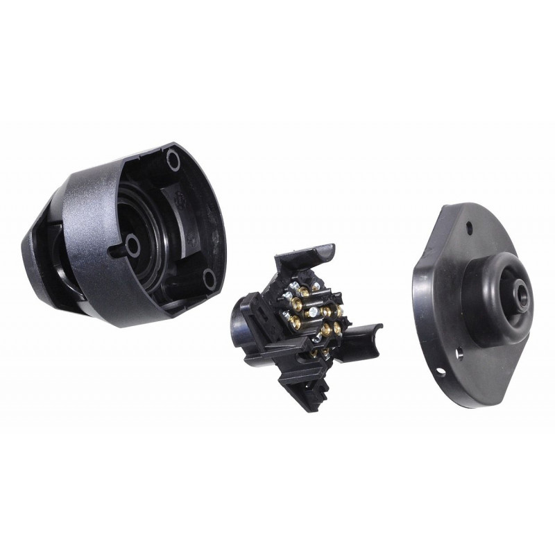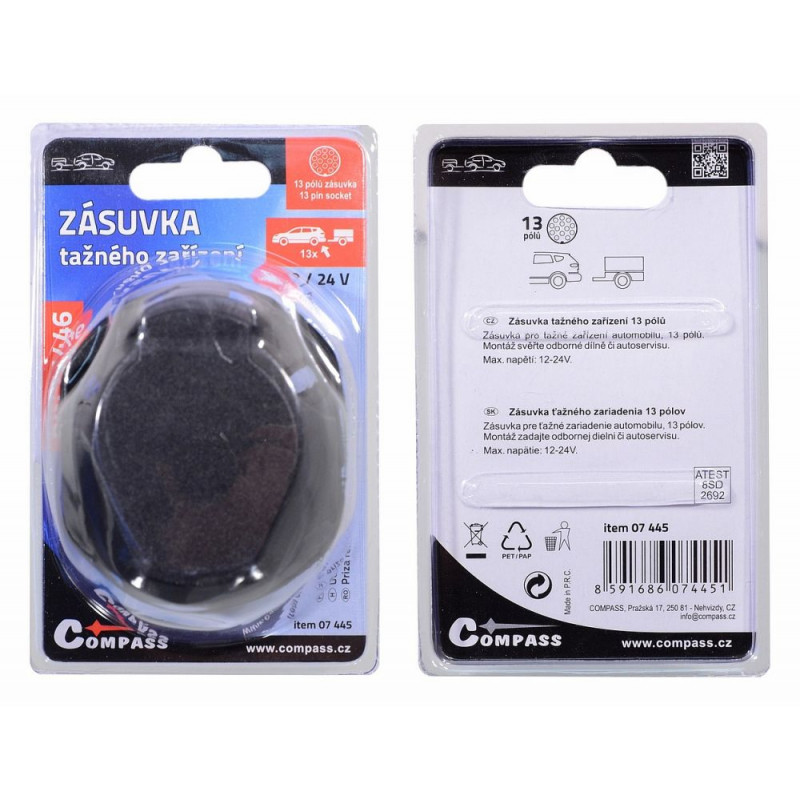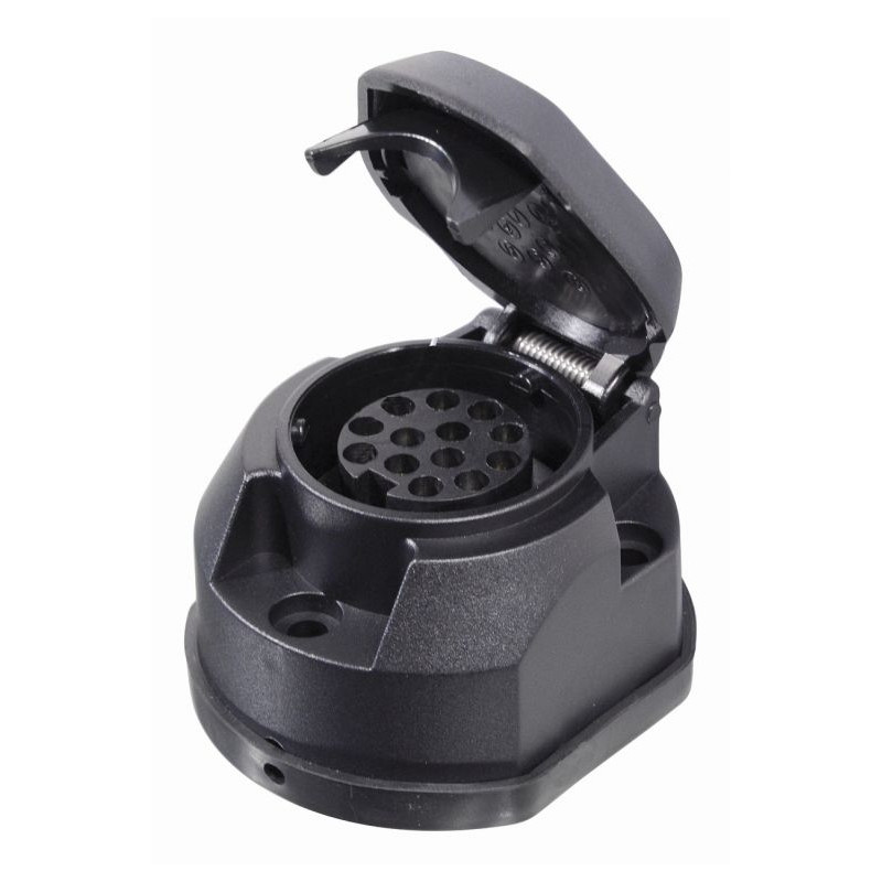 Zásuvka pre ťažné zariadenie automobilu podľa normy DIN 11446, 13 pólov. Zásuvka je vybavená tesnením a krytom, ktorý sa automaticky (pružinou) uzatvára.